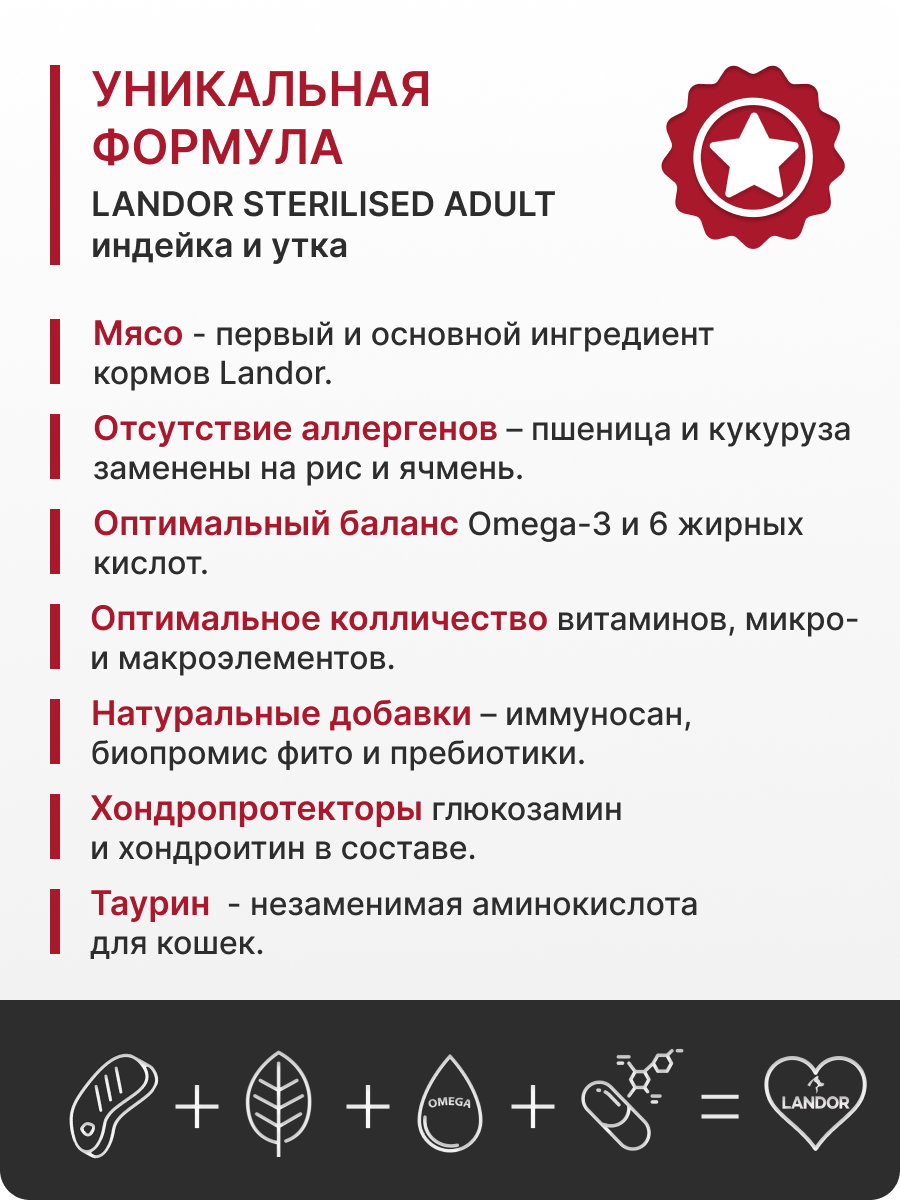СохранитьLANDOR сухой корм для взрослых стерилизованных кошек индейка и утка 2 кг интересное: