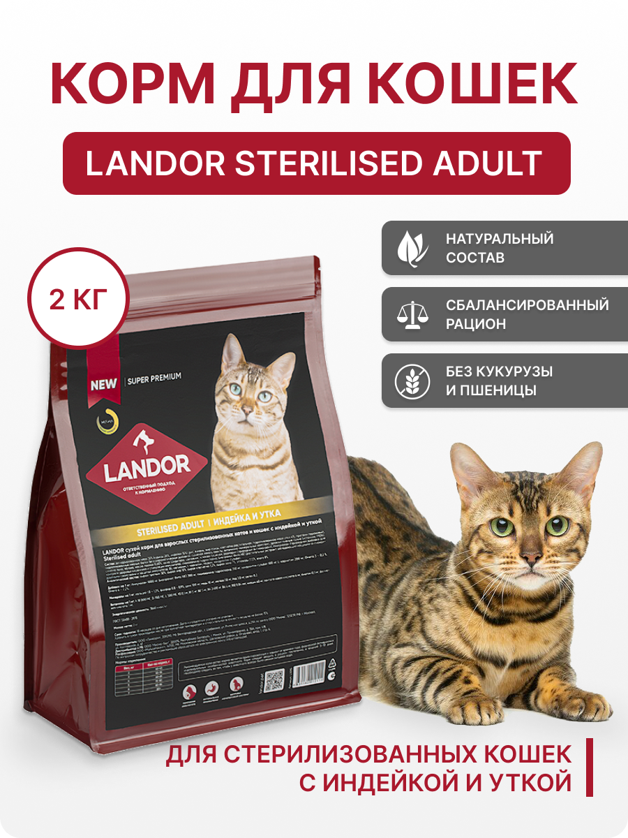 Сухой корм LANDOR для стерилизованных кошек индейка и утка 2кг / Ландор