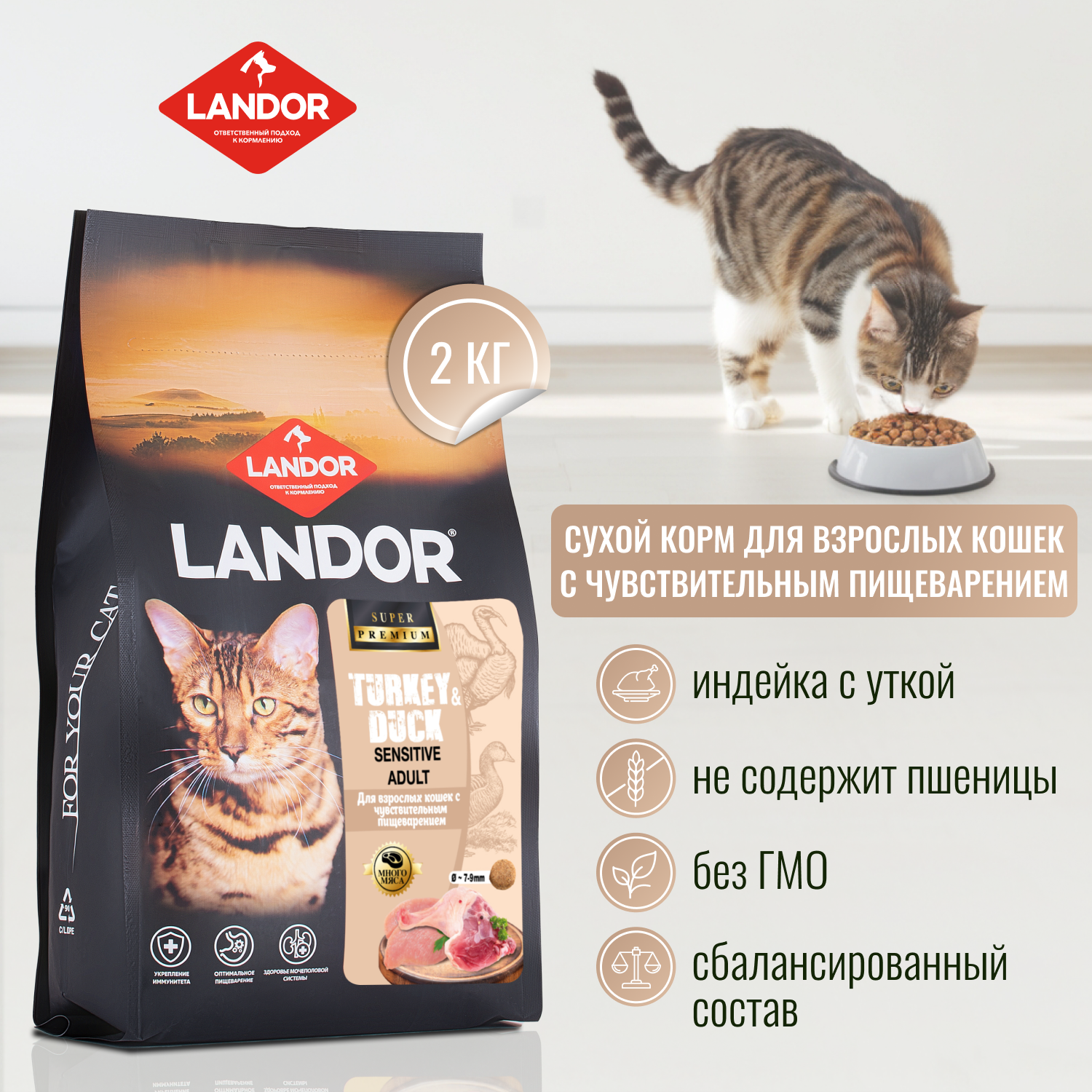 Landor SENSITIVE ADULT Полнорационный сухой корм для взрослых кошек, с чувствительным пищеварением, c индейкой и уткой 2 кг