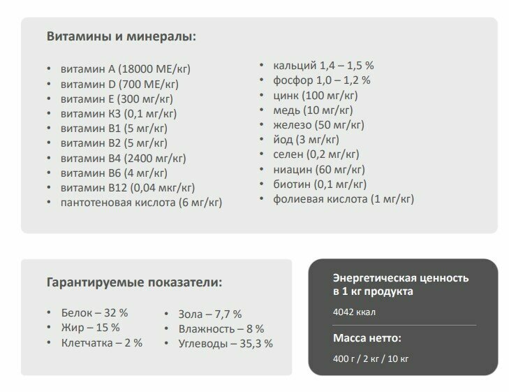 | Витамины | витамин D3 200 МЕ, витамин E 22 мг, витамин С 40 мг, витамин В1 12 мг, витамин В2 6 мг, витамин В6 3 мг, витамин В12 75 мг, ниацинамид 15 мг, кальция д-пантотенат 9 мг, фолиевая кислота 0,35 мг, биотин 300 мкг, холина хлорид 700 мг, цинк 25 мг, марганец 1,4 мг, йод 0,75 мг, медь 1 мг |