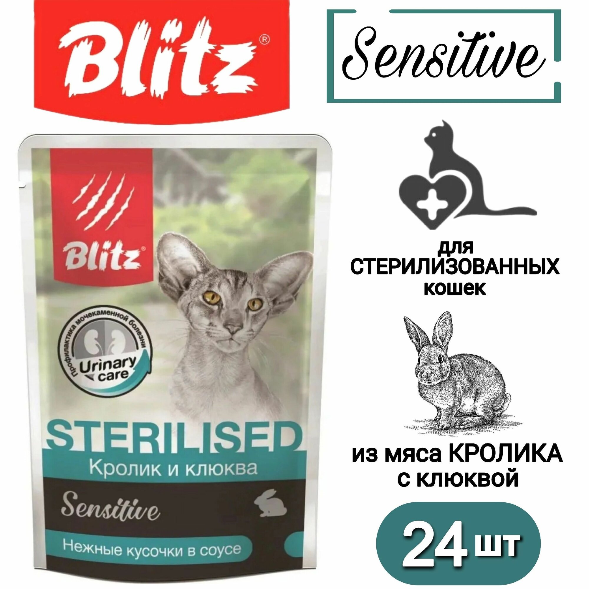 Корм влажный Blitz (pet) Blitz Sensitive для стерилизованных кошек Кролик и клюква кусочки в соусе, 24шт х85 г