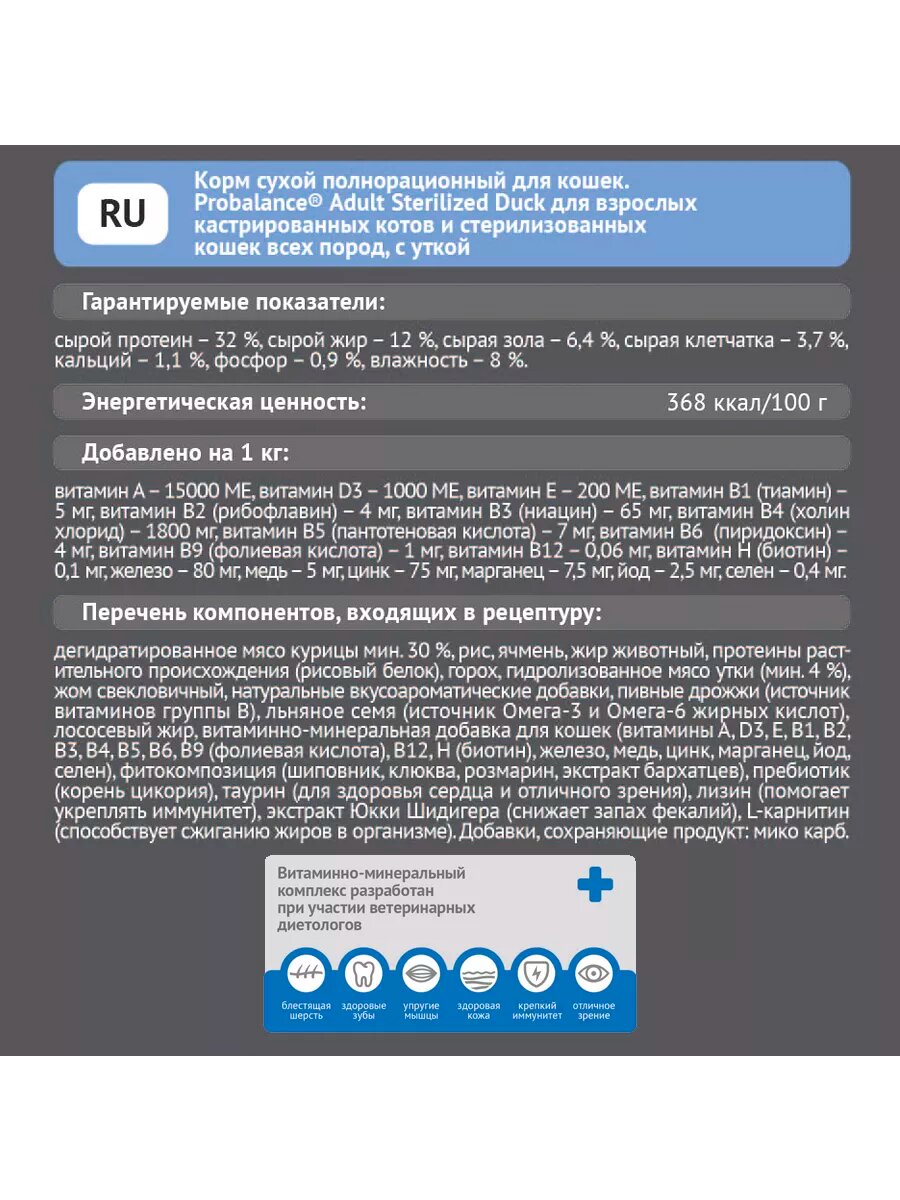 Корм сухой Probalance Adult Sterilized Duck для стерилизованных кошек и кастрированных котов, с уткой, мешок 1,8 кг