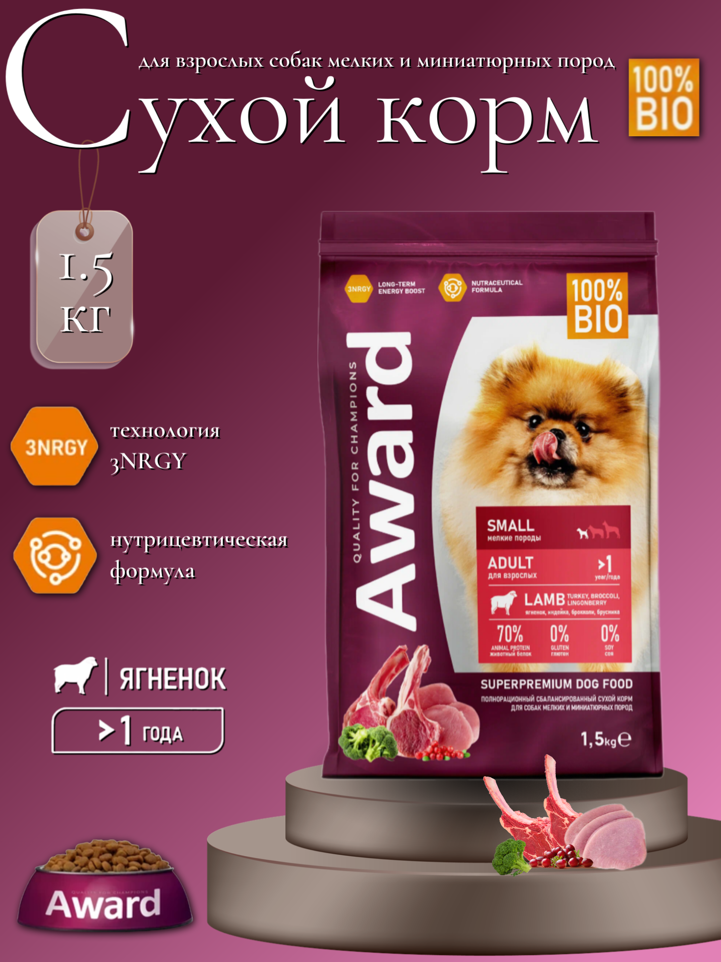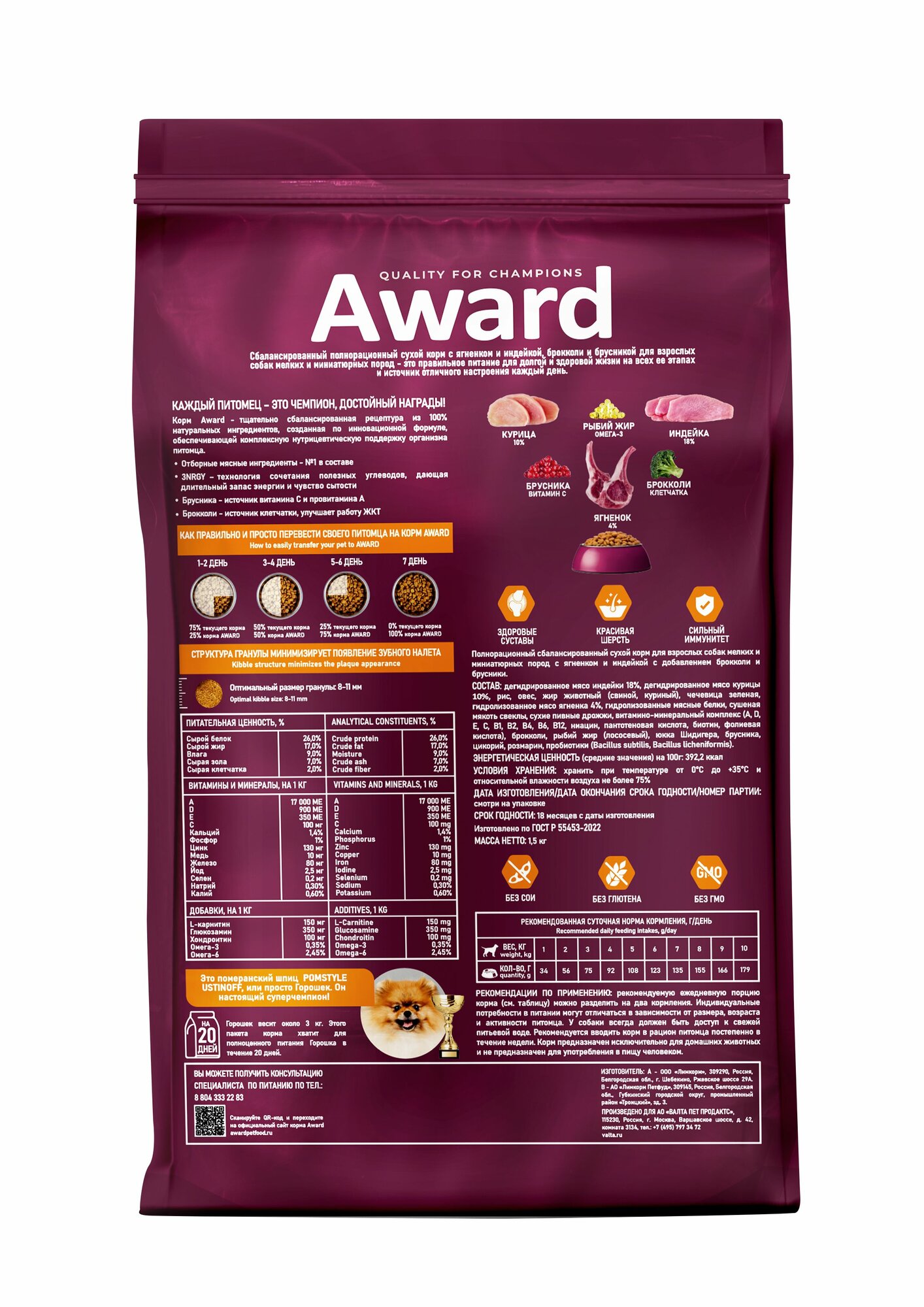 Купить AWARD Сухой корм для взрослых собак мелких и миниатюрных пород с ягненком и индейкой с добавлением брокколи и брусники 1.5кг