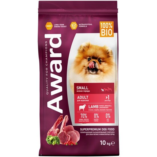 Купить Корм сухой Award для взрослых собак мелких и миниатюрных пород с ягненком и индейкой с добавлением брокколи и брусники 10кг