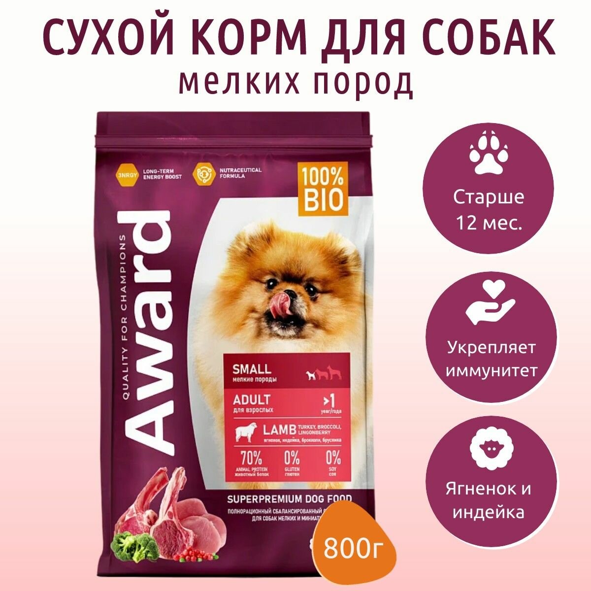 Сухой корм AWARD для взрослых собак мелких и миниатюрных пород с ягненком и индейкой с добавлением брокколи и брусники, 800гр