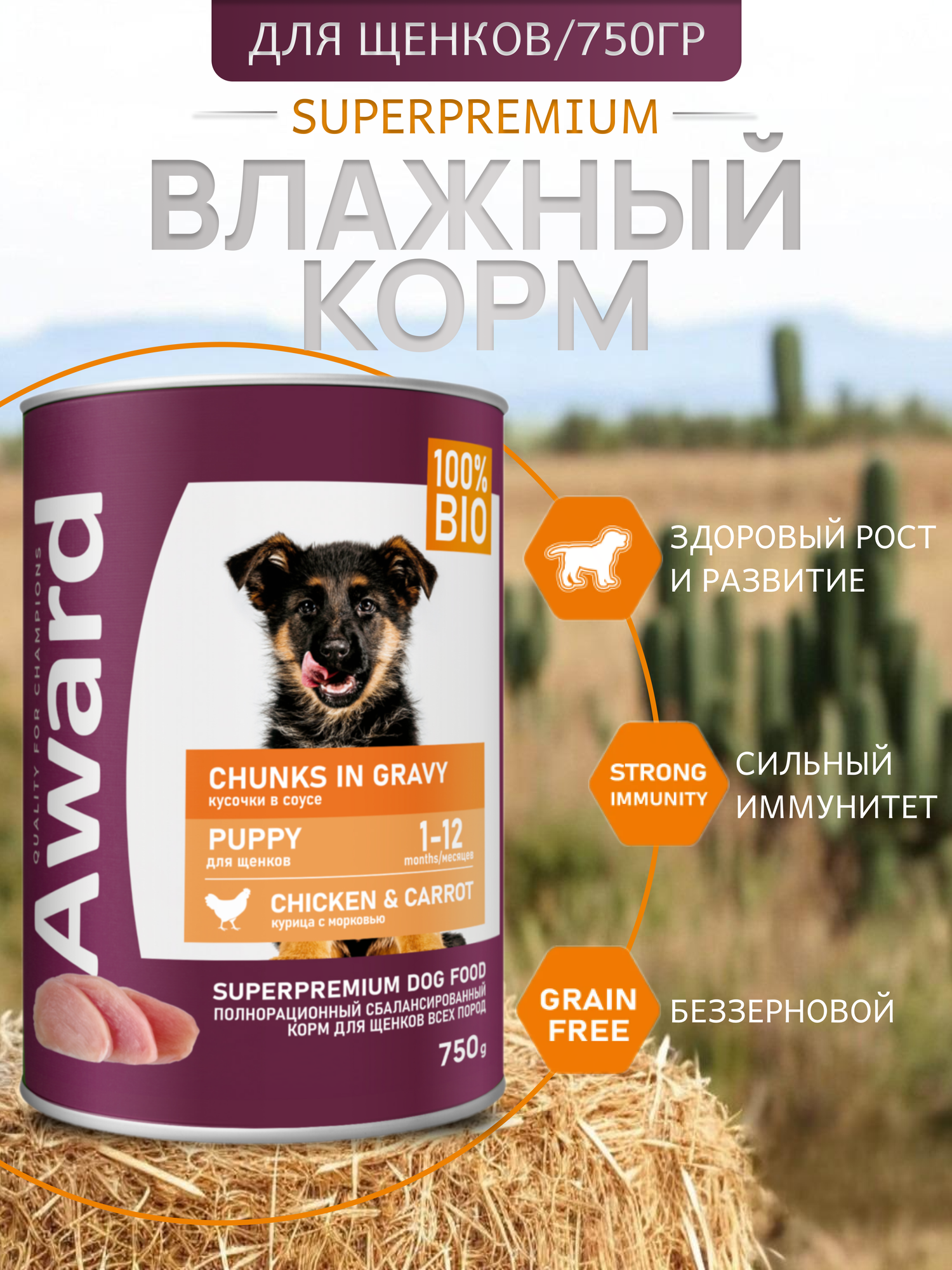 Влажный корм AWARD для щенков кусочки с курицей и морковью 750г * 12 шт