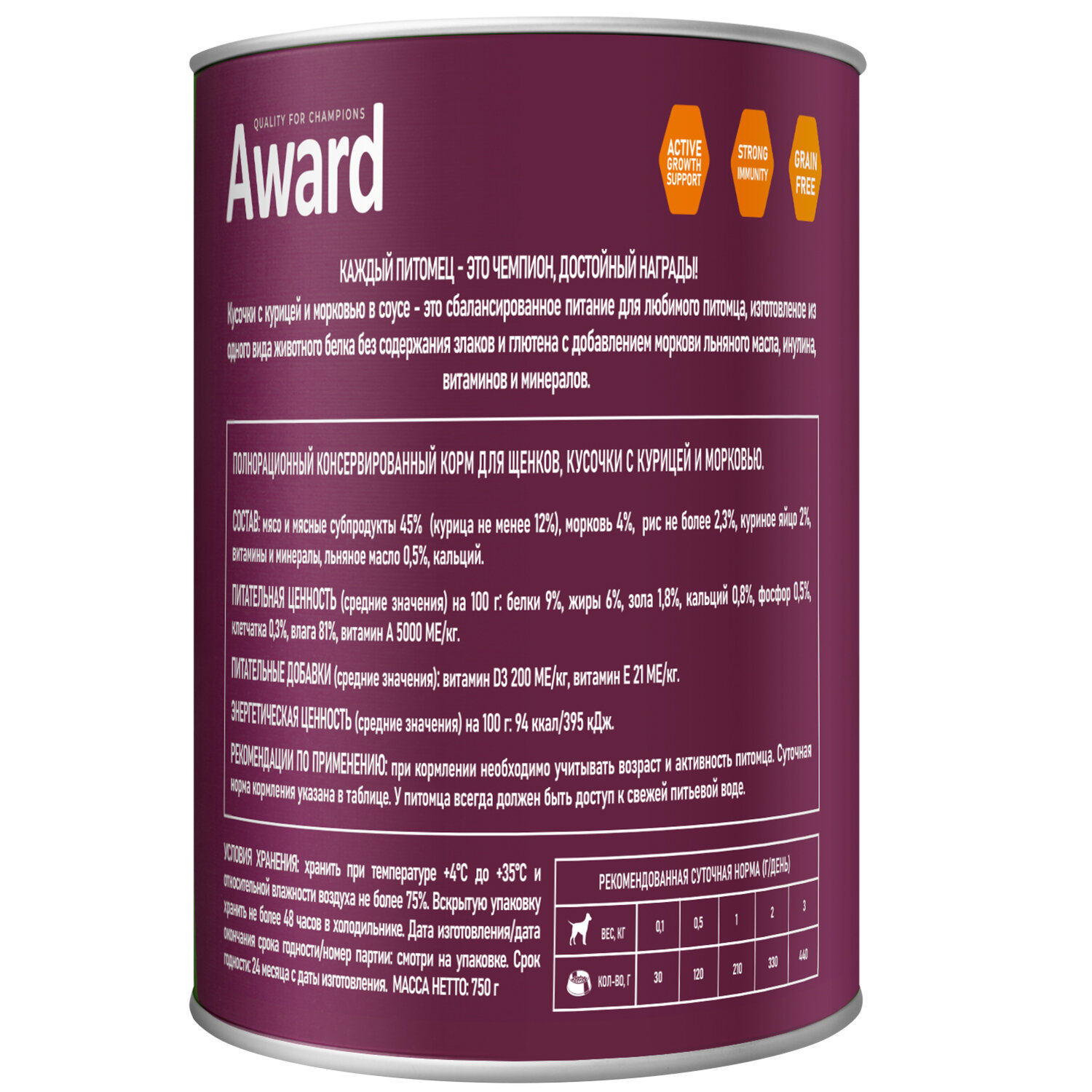 Влажный корм AWARD для щенков кусочки с курицей и морковью 750г х 3шт