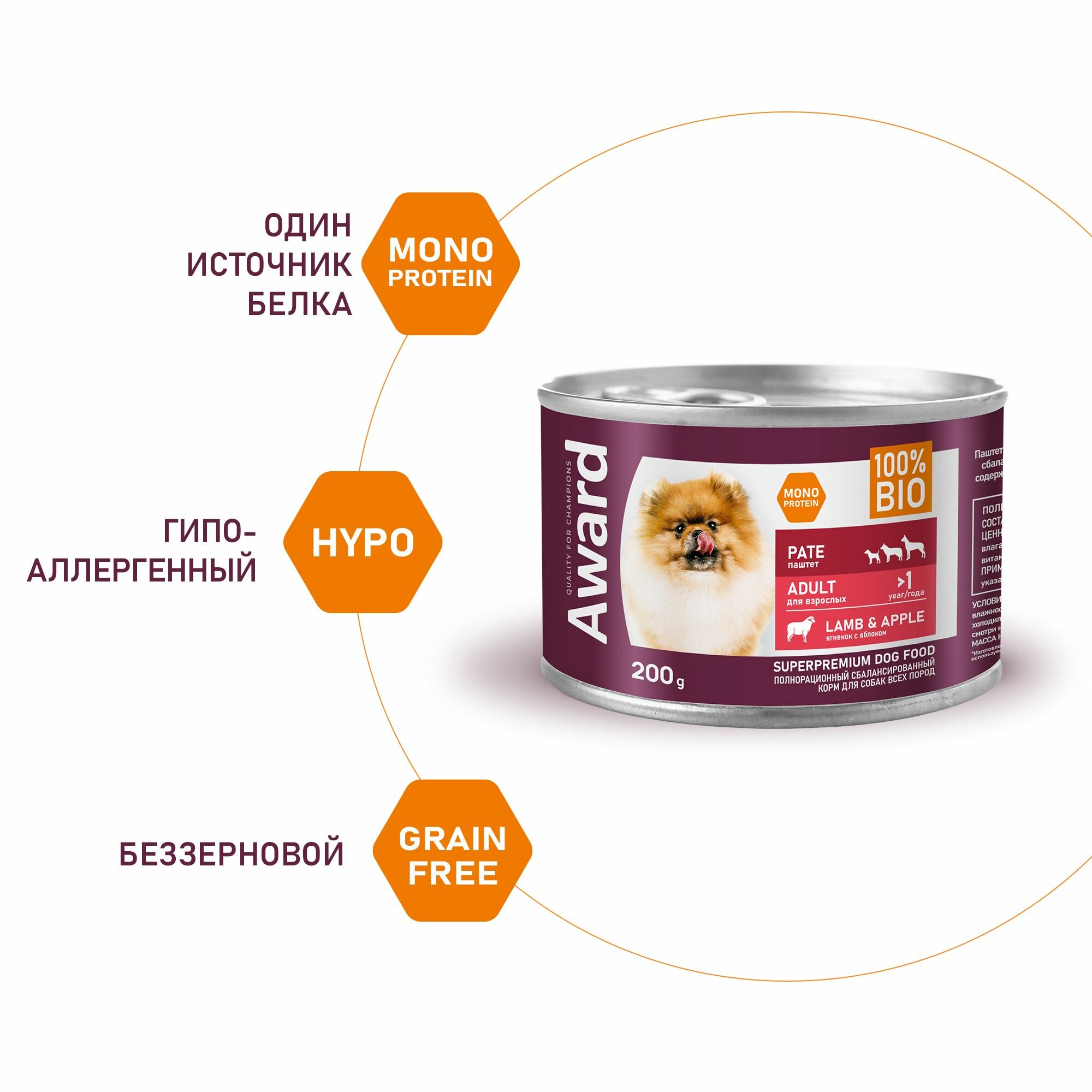 AWARD LAMB & APPLE монопротеиновые для взрослых собак всех пород паштет ягненком и яблоком банка 200 гр х 12 шт