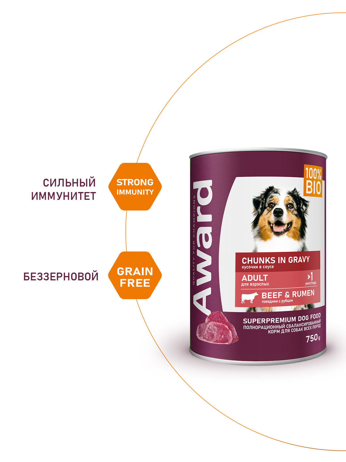 AWARD BEEF & RUMEN для взрослых собак всех пород с говядиной и рубцом в соусе банка 750 гр х 12 шт