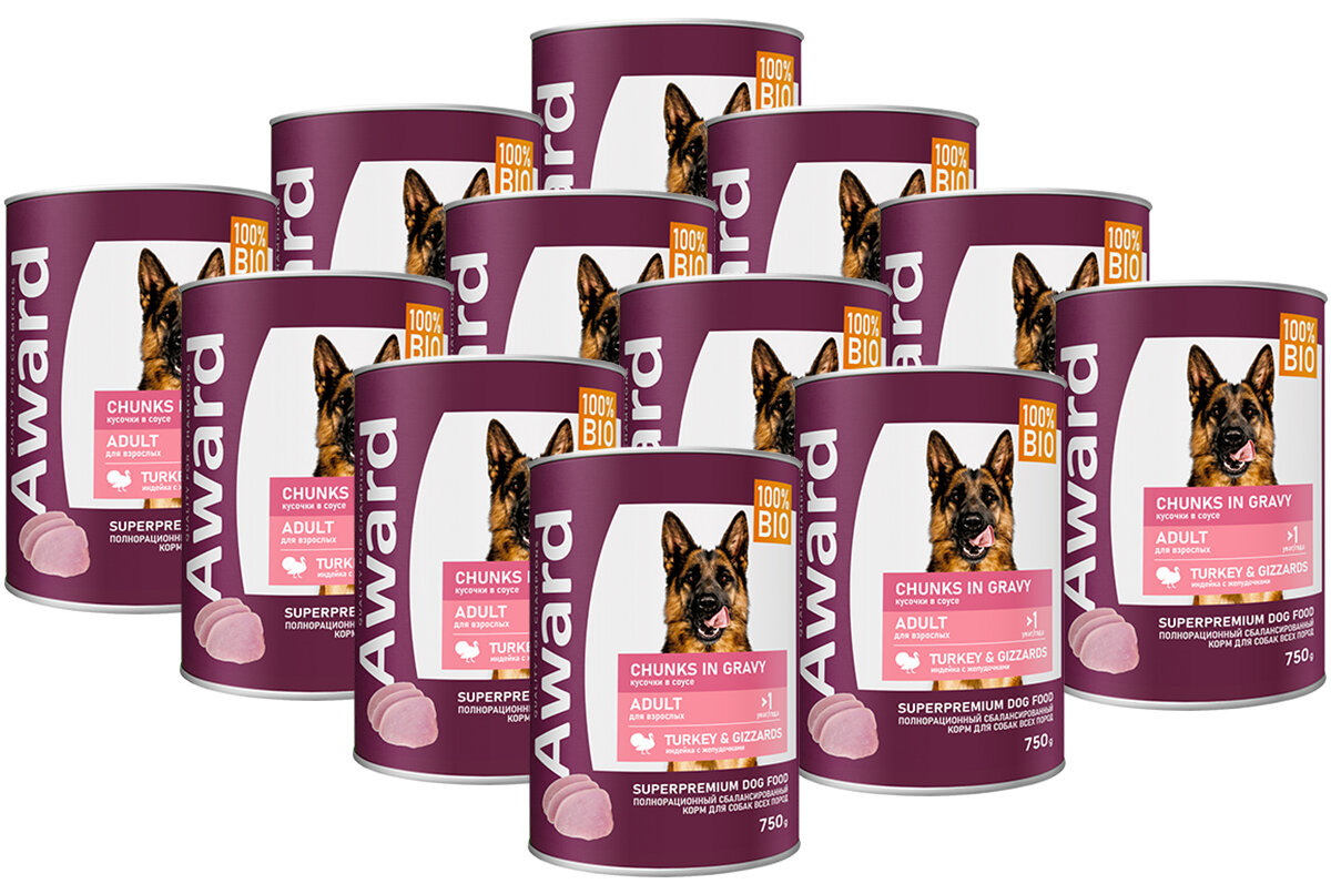 Купить Влажный корм AWARD для собак кусочки с индейкой и желудочками в соусе 750г * 12 шт