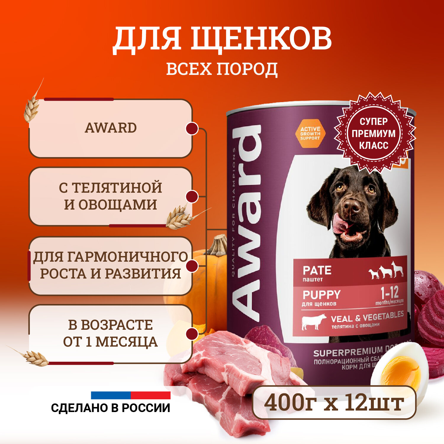 AWARD влажный корм для щенков от 1 месяца, паштет с телятиной и овощами, в консервах - 400 г х 12 шт