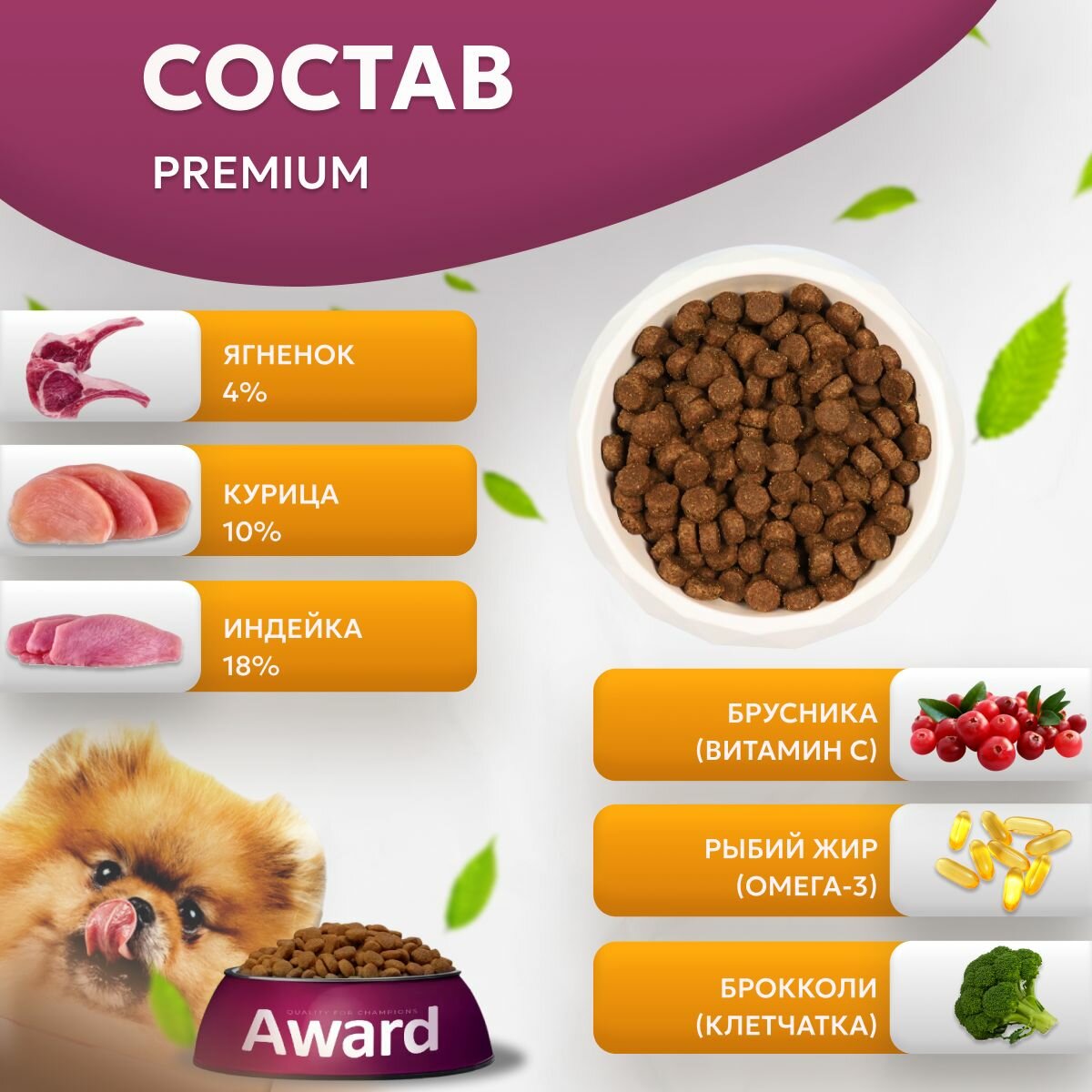 AWARD Сухой корм для взрослых собак мелких и миниатюрных пород с ягненком и индейкой с добавлением брокколи и брусники 1.5кг