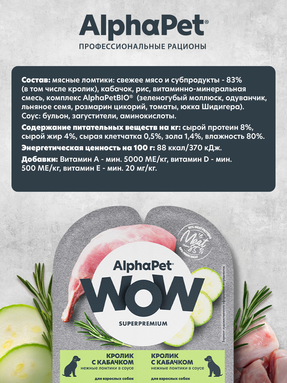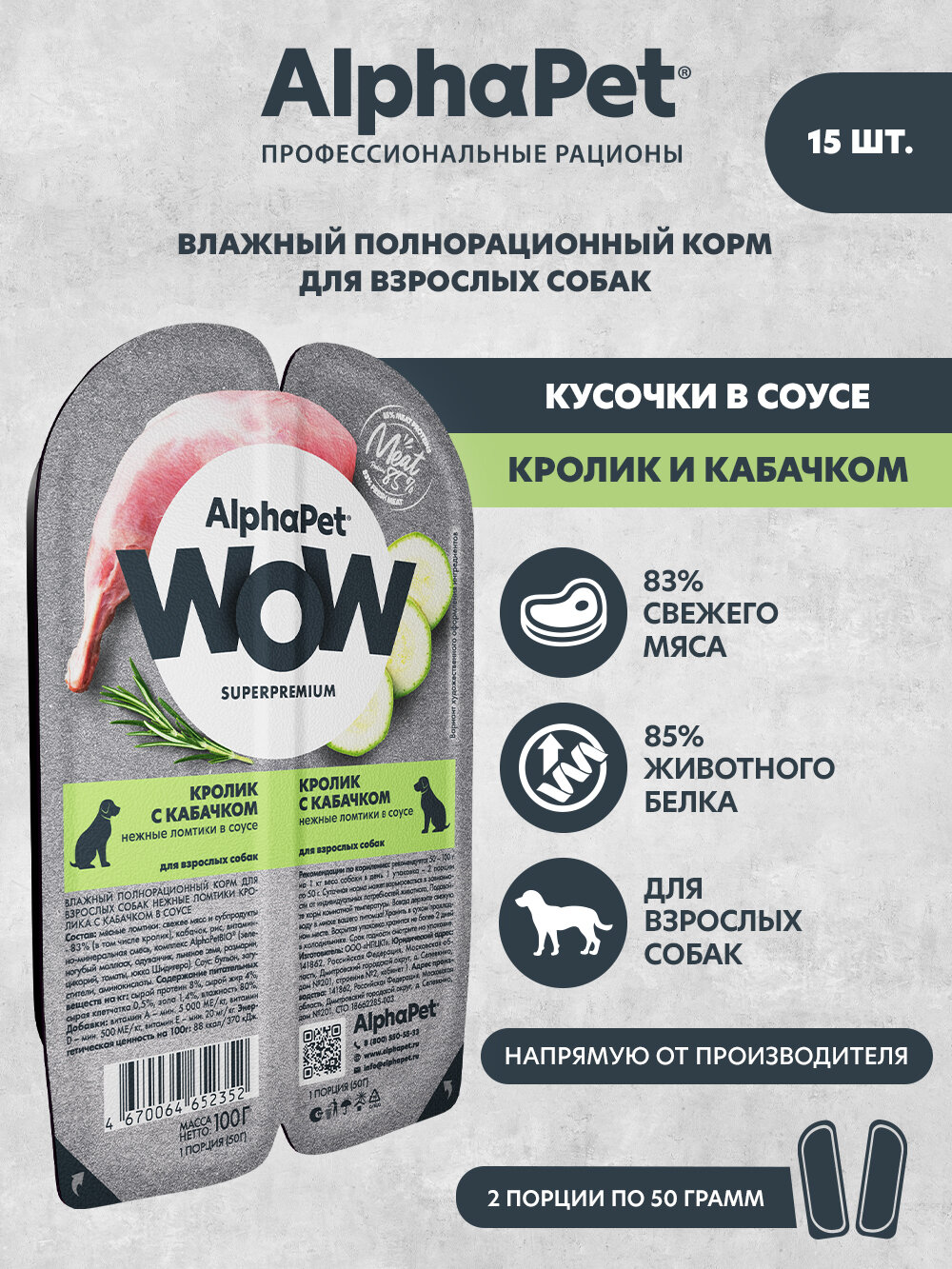 Купить Влажный полнорационный корм холистик для взрослых собак AlphaPet WOW Superpremium Кролик с кабачком нежные ломтики в соусе (Упаковка 15 блистеров)