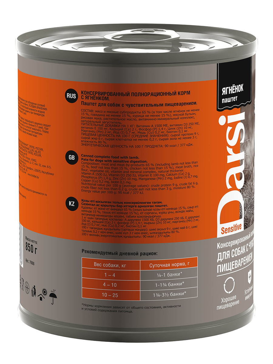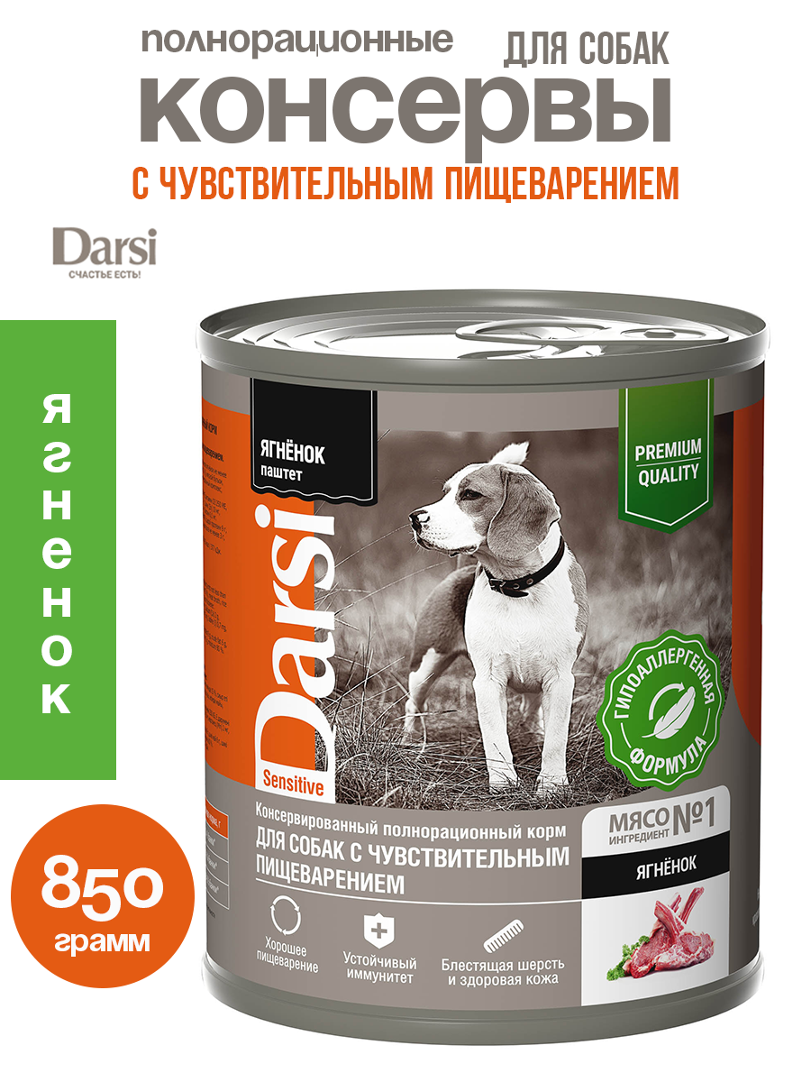 Darsi Консервы "Ягненок" для собак с чувствительным пищеварением, паштет 0.85 кг