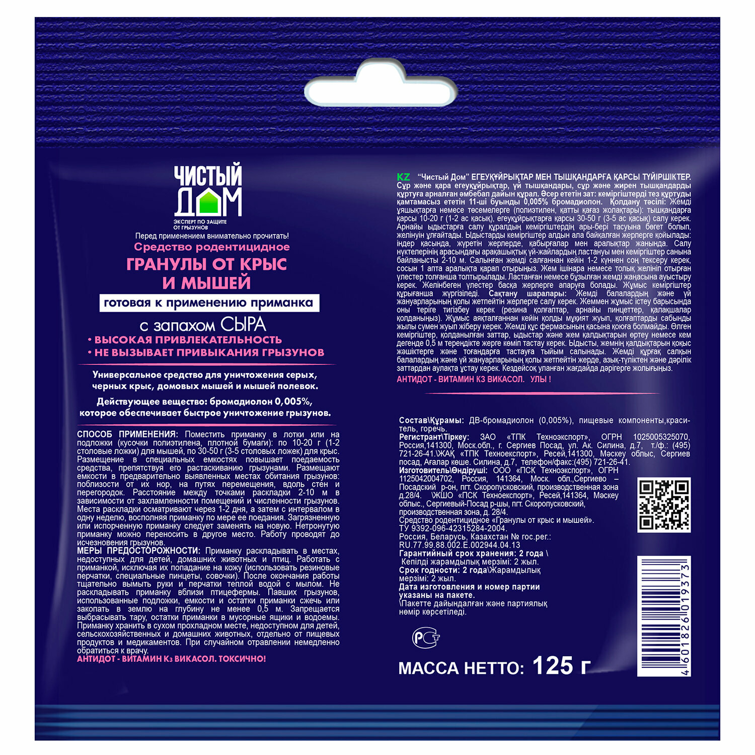 | Дополнительная информация | меры предосторожности: приманку раскладывать в местах, недоступных для детей и домашних животных; работать с приманкой, исключая ее попадание на кожу (использовать резиновые перчатки, специальные совочки, ложки); после окончания работы тщательно вымыть руки и перчатки теплой водой с мылом; павших грызунов, использованные подложки, емкости и остатки приманки сжечь или закопать в землю на глубину не менее 0,5 м; запрещается выбрасывать тару, остатки приманки в мусорные ящики и водоемы; приманку хранить в сухом прохладном месте отдельно от пищевых продуктов и медикаментов; при случайном отравлении немедленно обратиться к врачу; антидот – витамин КЗ викасол |
