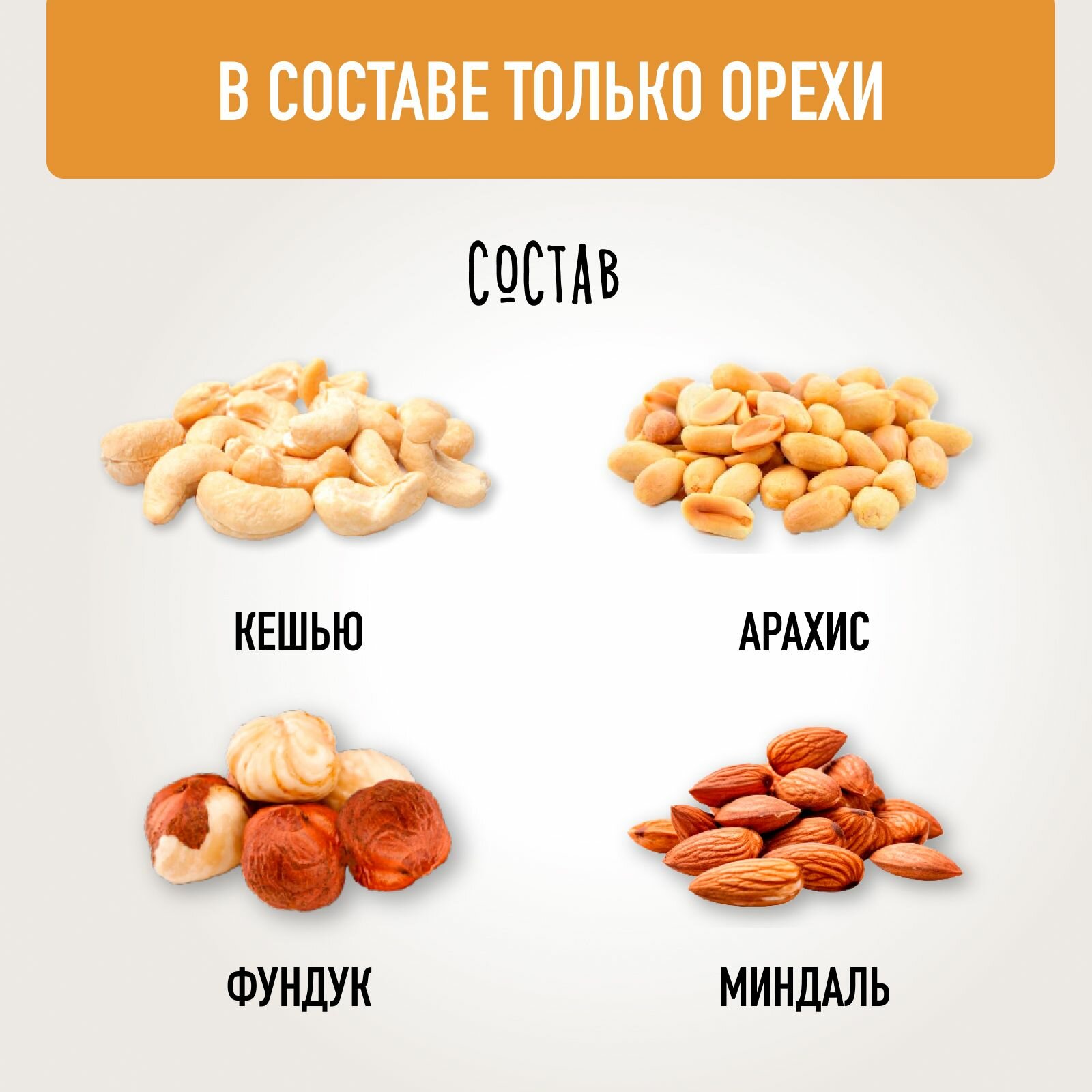 | Состав | арахис жареный, миндаль жареный, кешью жареный, фундук жареный, клюква сушеная |