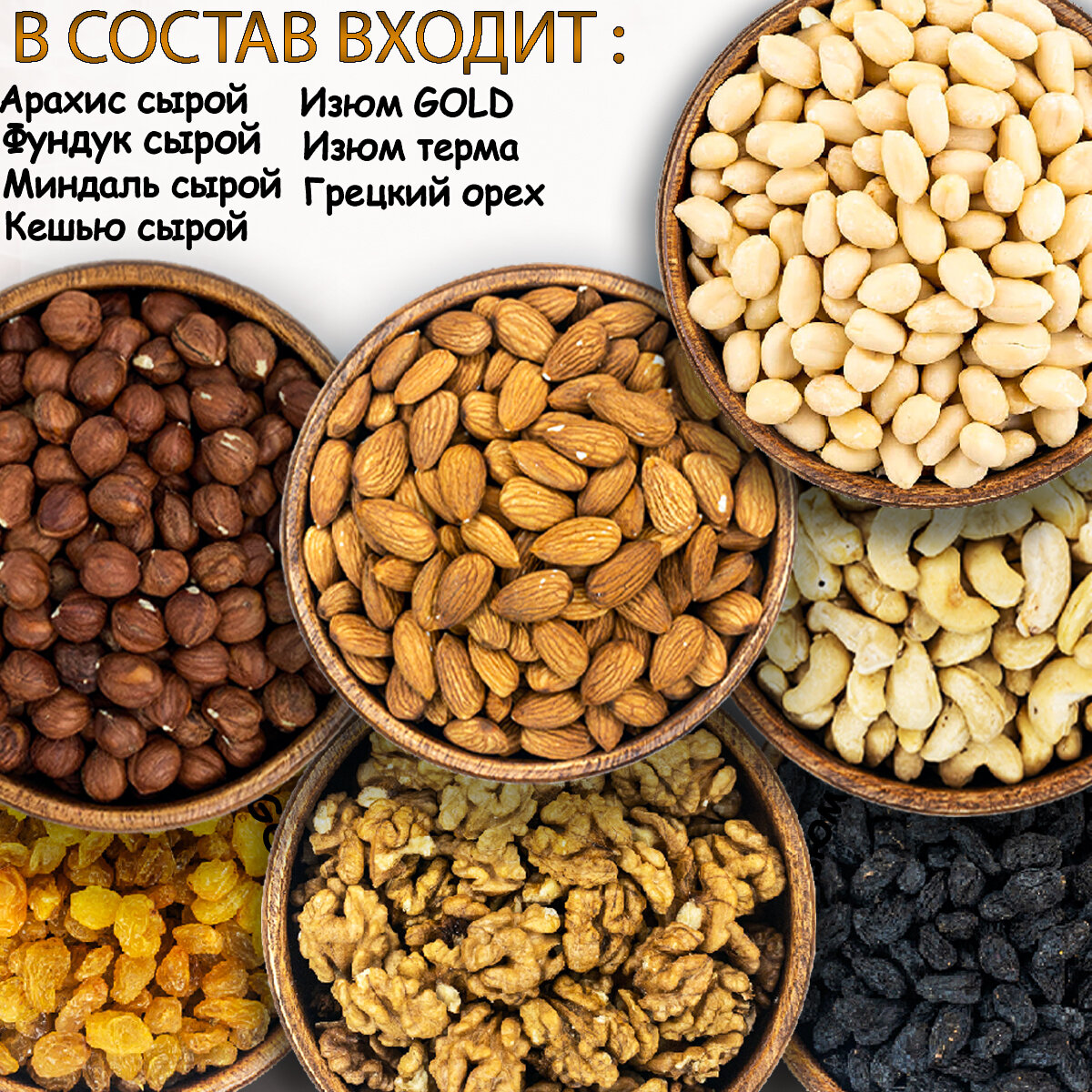 | Состав | Миндаль сырой; Арахис сырой; Набор орехов; Орех фундук сырой очищенный; Кешью сырой сушеный |