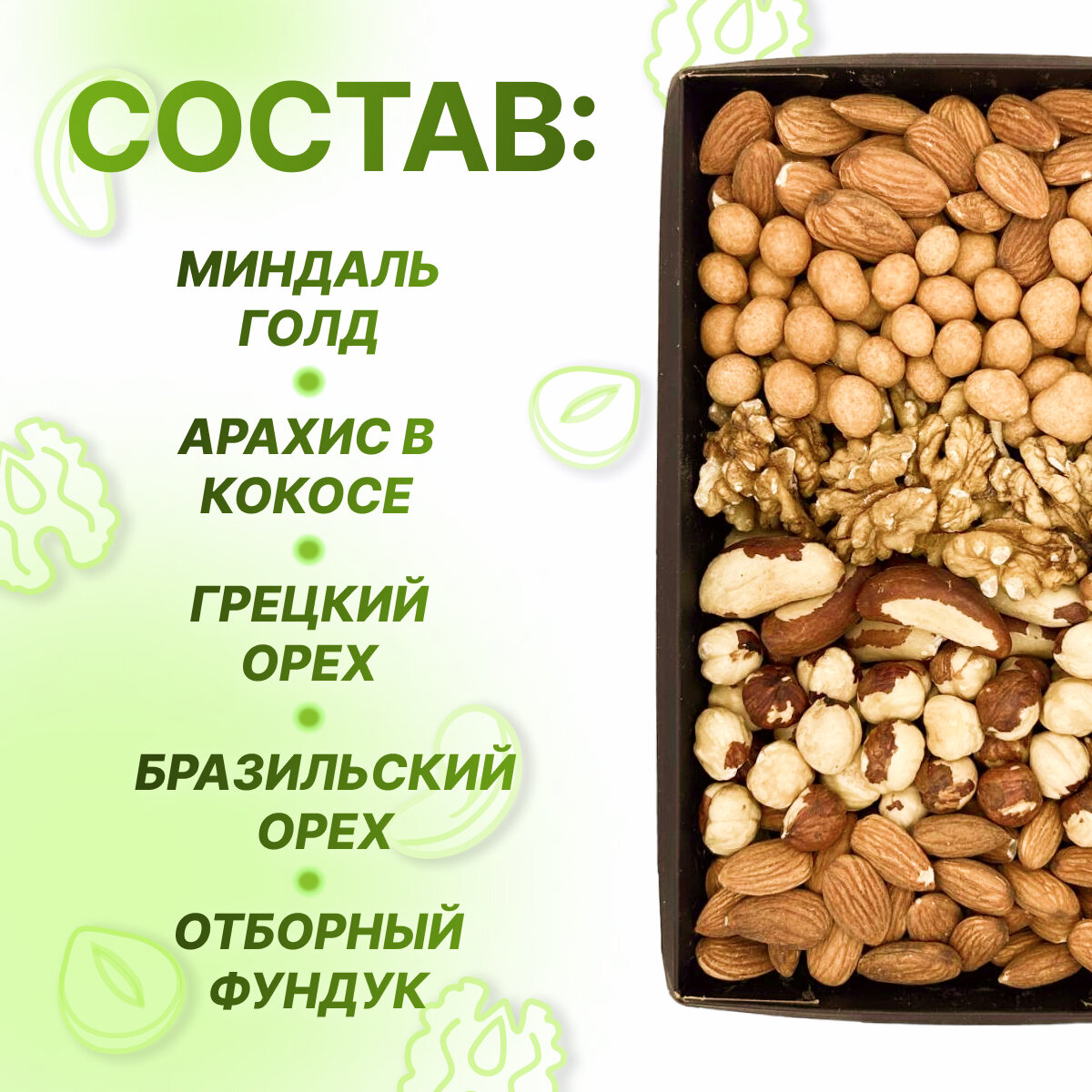 | Вид орехов | арахис / бразильский орех / грецкий орех / миндаль / фундук |