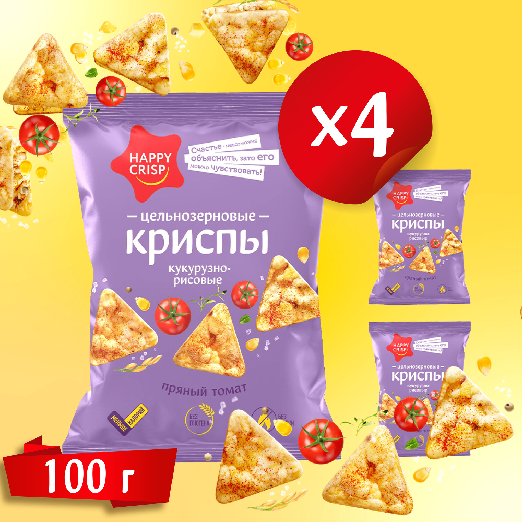 Чипсы (криспы) цельнозерновые HAPPY CRISP Пряный томат 4 шт по 50 г