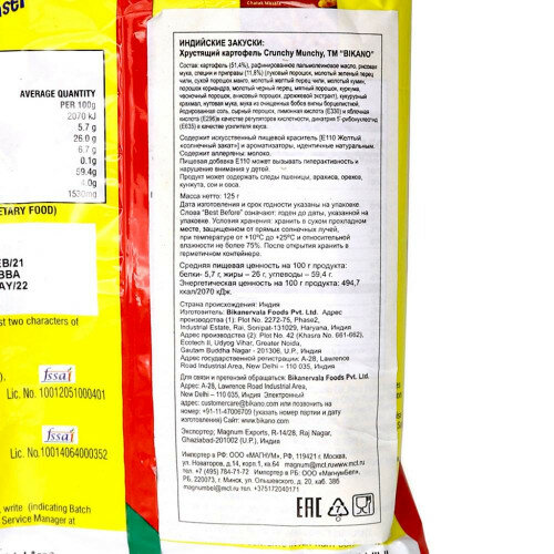 | Состав | картофель (51,4%), рафинированное пальмолеиновое масло, рисовая мука, специи и приправы (11,8%) (луковый порошок, молотый зеленый перец чили, сухой порошок манго, молотый желтый перец чили, молотый кумин, порошок кориандра, молотый черный перец, мятный порошок, куркума, чесночный порошок, анисовый порошок, дрожжевой экстракт), кукурузный крахмал, нутовая мука, мука из очищенных бобов вигны борцелистной, йодированная соль, сырный порошок, лимонная кислота (E330) и яблочная кислота (E296) в качестве регуляторов кислотности, динатрия 5’-рибонуклеотид (E635) в качестве усилителя вкуса. Содержит искусственный пищевой краситель [E110 Желтый «солнечный закат»] и ароматизаторы, идентичные натуральным. Содержит аллергены: молоко. Пищевая добавка E110 может вызывать гиперактивность и нарушение внимания у детей. Продукт может содержать следы пшеницы, арахиса, орехов, кунжута, сои и овса |