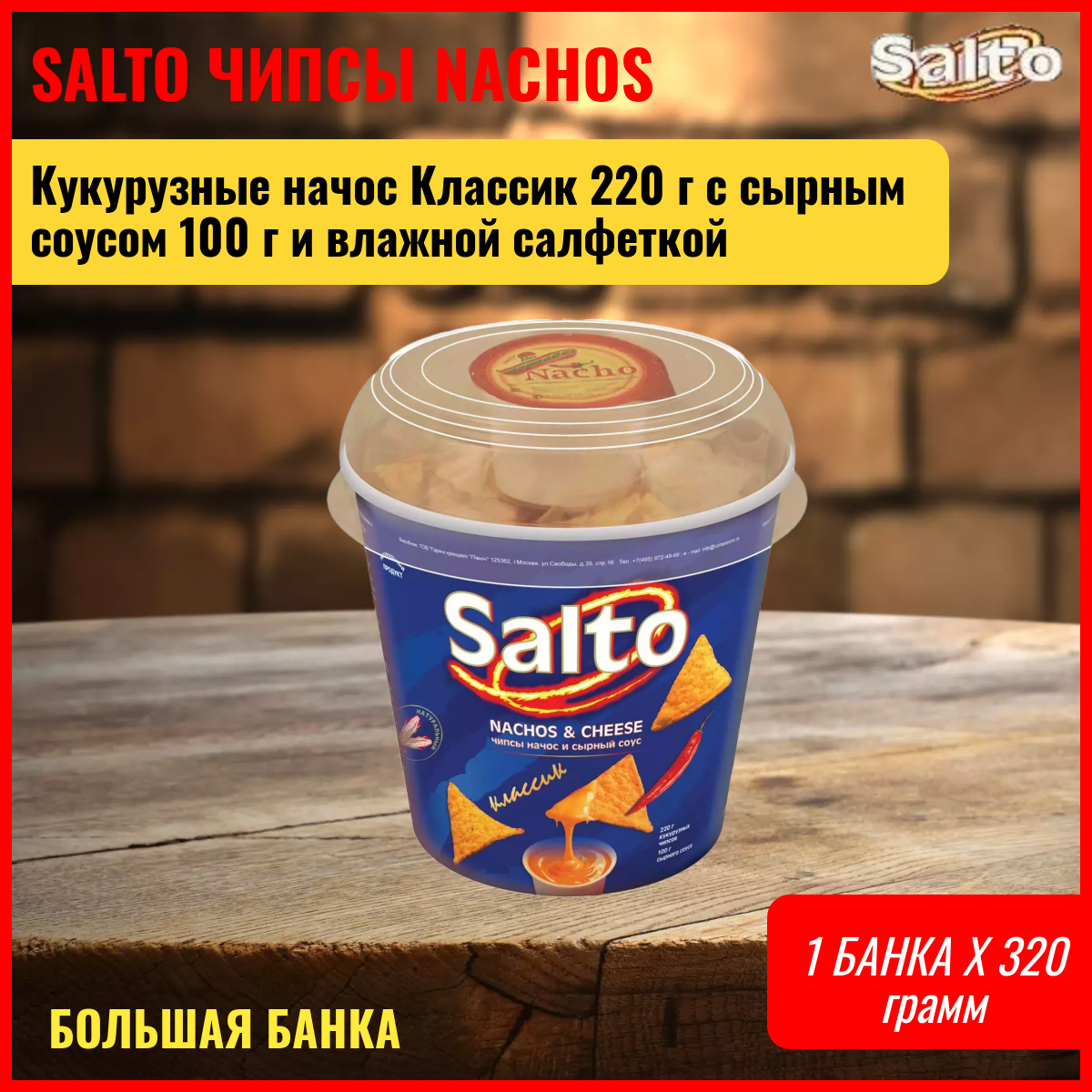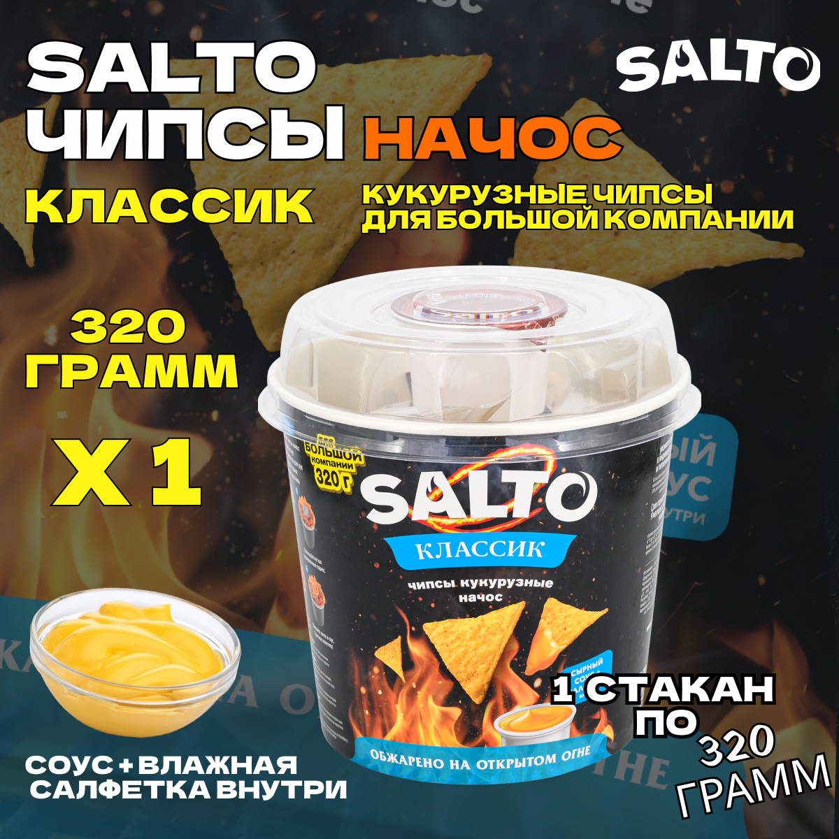 | Дополнительная информация | состав набора массой 220 г: чипсы начос 220 г, сырный соус 100 г, влажная салфетка для рук; состав набора массой 60 г: чипсы начос 60 г, сырный соус 80 г, влажная салфетка для рук |