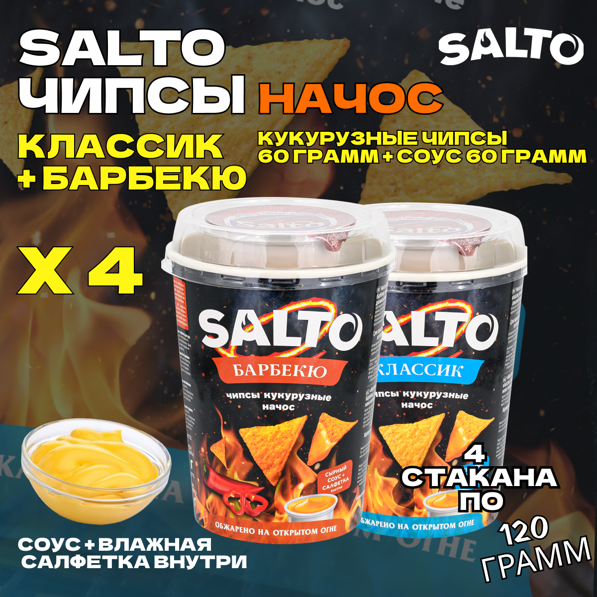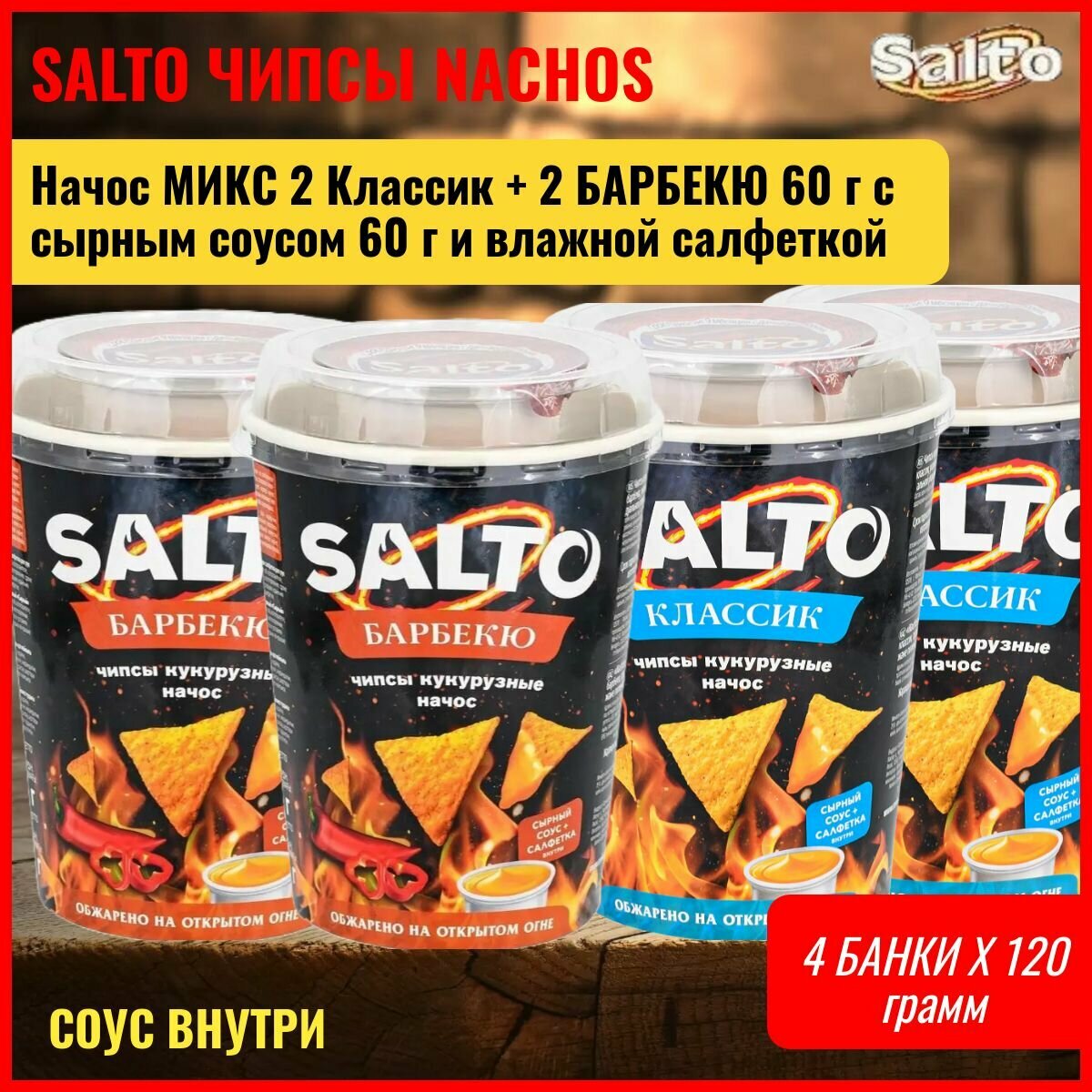Купить Кукурузные чипсы начос Классик+Барбекю 4 банки Salto 60 г с сырным соусом 60 г и влажной салфеткой