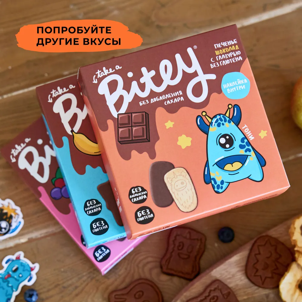 Печенье детское без сахара шоколадное Take a Bitey / Bite, ассорти 3 вкусов, без глютена, 4 шт по 125 гр