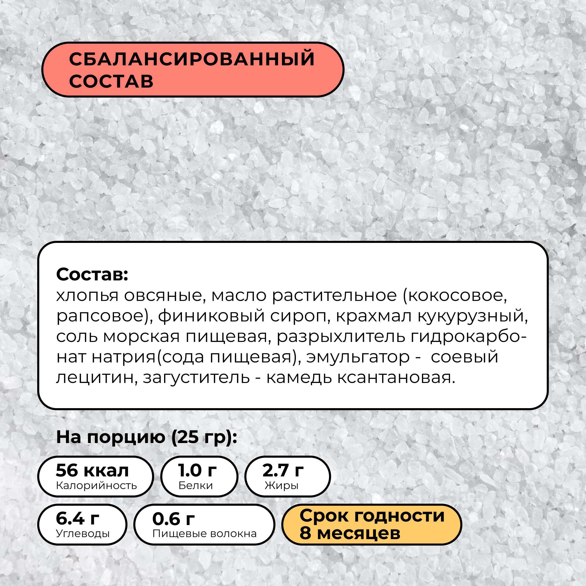 | Состав | хлопья овсяные, финиковый сироп, масло кокосовое, масло рапсовое, крахмал кукурузный, кокосовая стружка, семена чиа, разрыхлители: (пирофосфат натрия, гидрокарбонат аммония, гидрокарбонат натрия(сода пищевая)), соль морская, натуральный ароматизатор «кокос», эмульгатор - соевый лецитин, , загуститель – камедь ксантановая, подсластитель – стевизоид (экстракт стевии) . |