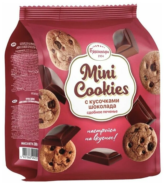 Печенье сдобное "Mini Cookies" с кусочками шоколада из ванильного теста, 200 грамм, Брянконфи, Изготовлено по ГОСТ 24901-2014, Артикул - 3045076 интересное: