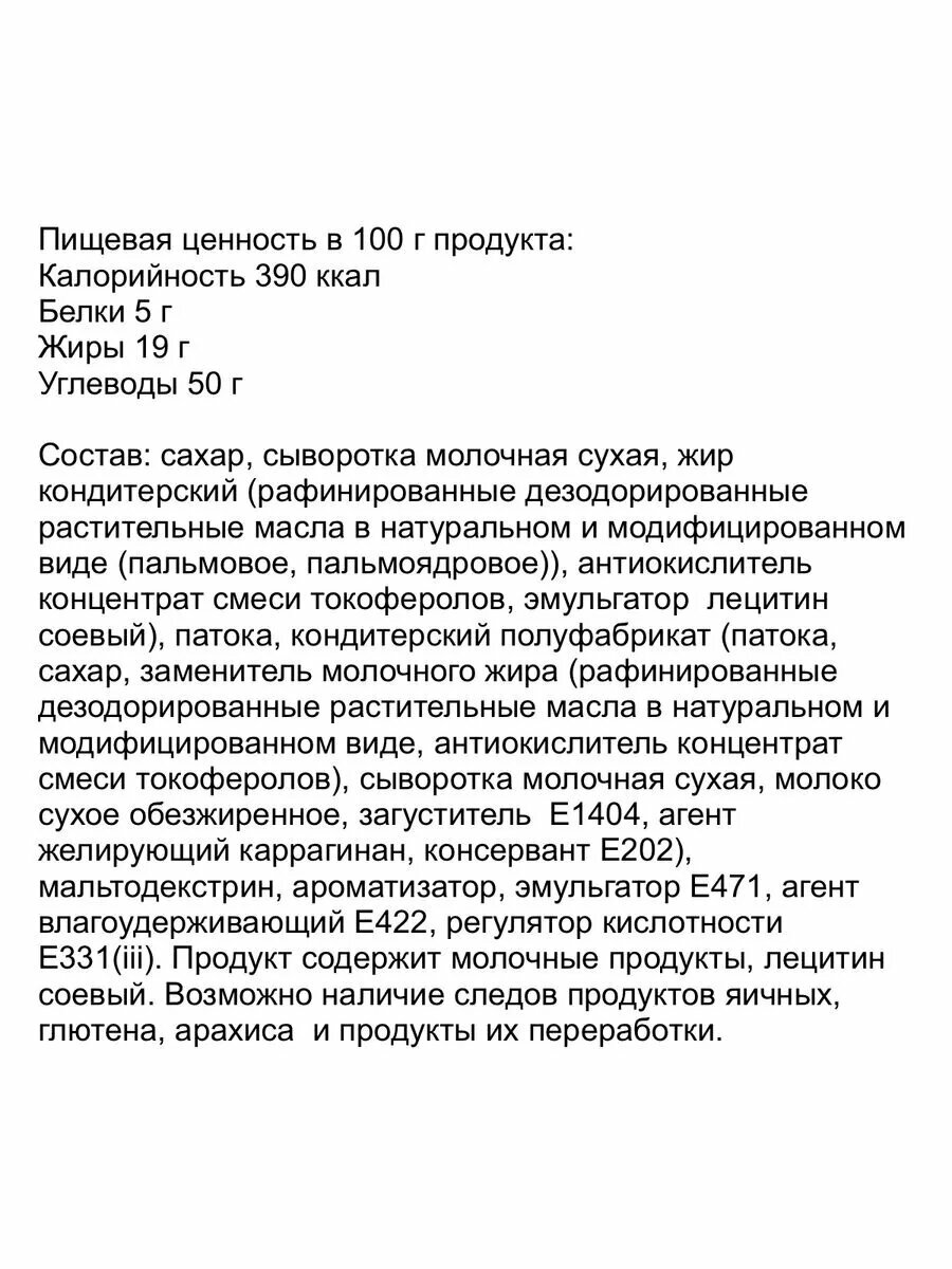 | Не содержит | ГМО / заменитель молочного жира / консерванты / пальмовое масло / сахар |