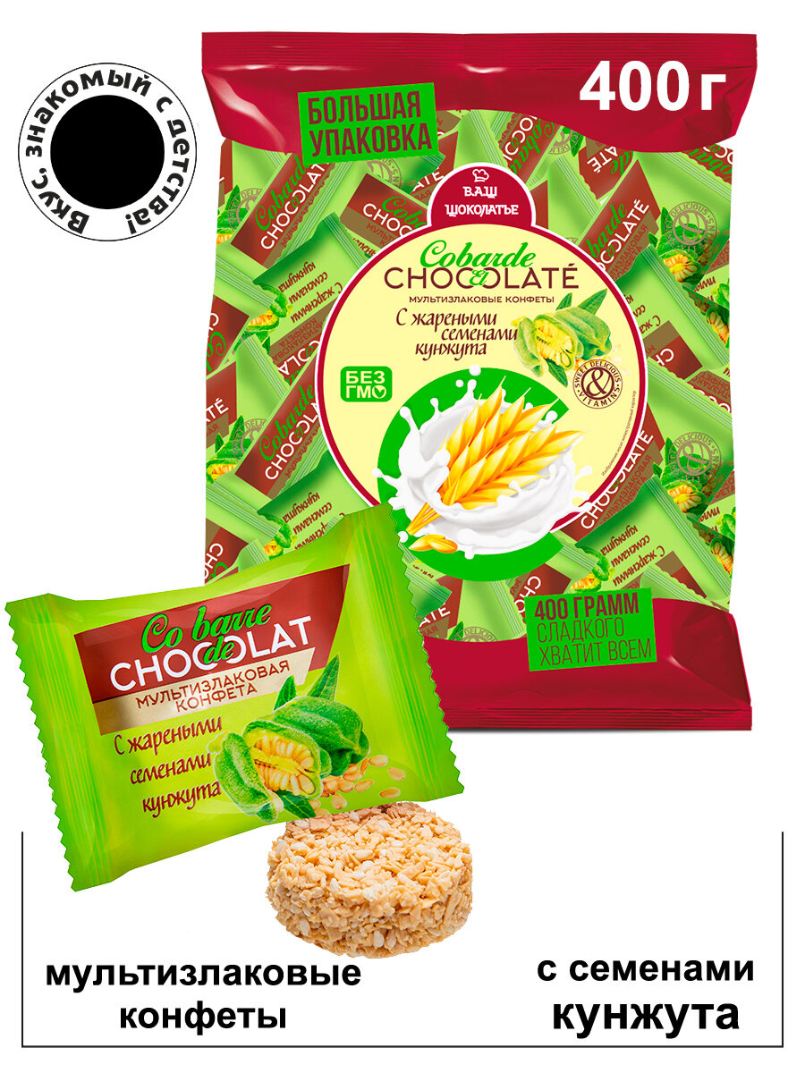 Конфеты В.А.Ш. Шоколатье Co barre de Chocolat (Кобардье) мультизлаковые с кунжутом в белой глазури, 400 г