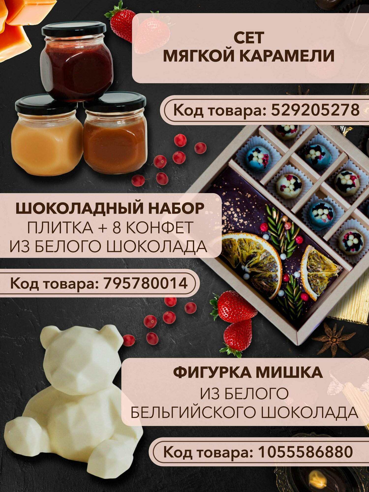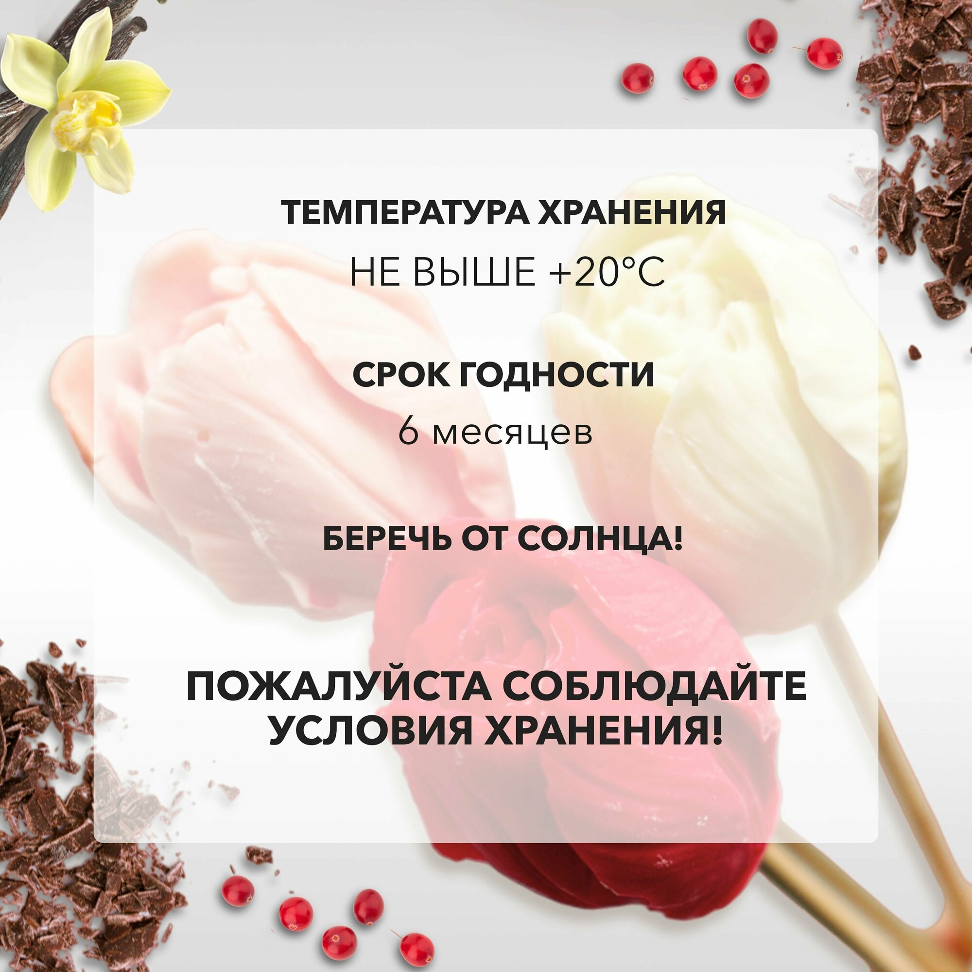 | Дополнительная информация | Шоколадный букет хранить при температуре от +12°С до +20°С, при относительной влажности не более 70%, в чистом, сухом помещении без посторонних запахов. Беречь от солнечных лучей. |