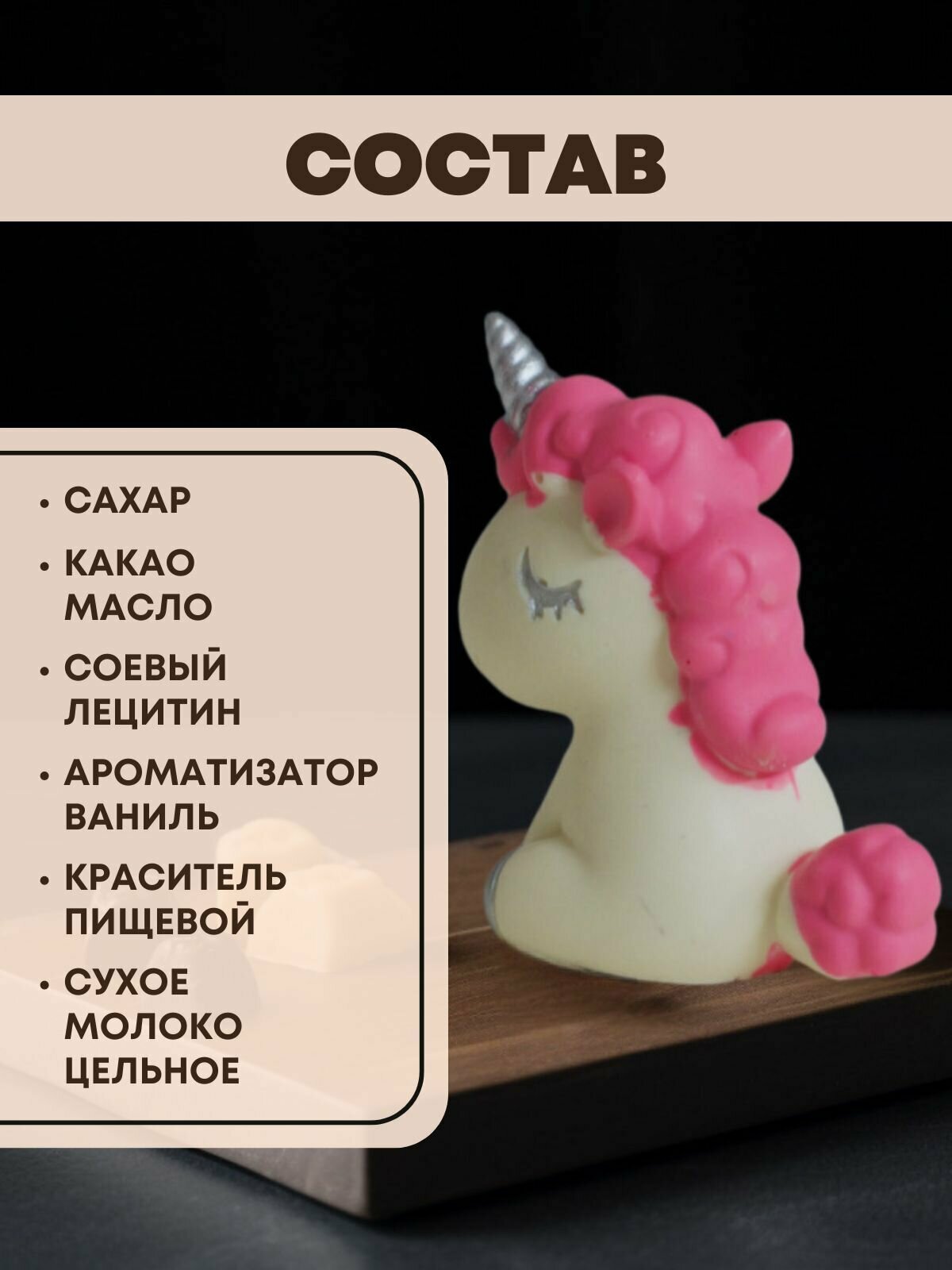 | Состав | Шоколад белый (сахар, масло какао, сухое молоко цельное, соевый лецитин, ароматизатор ваниль), краситель пищевой. |