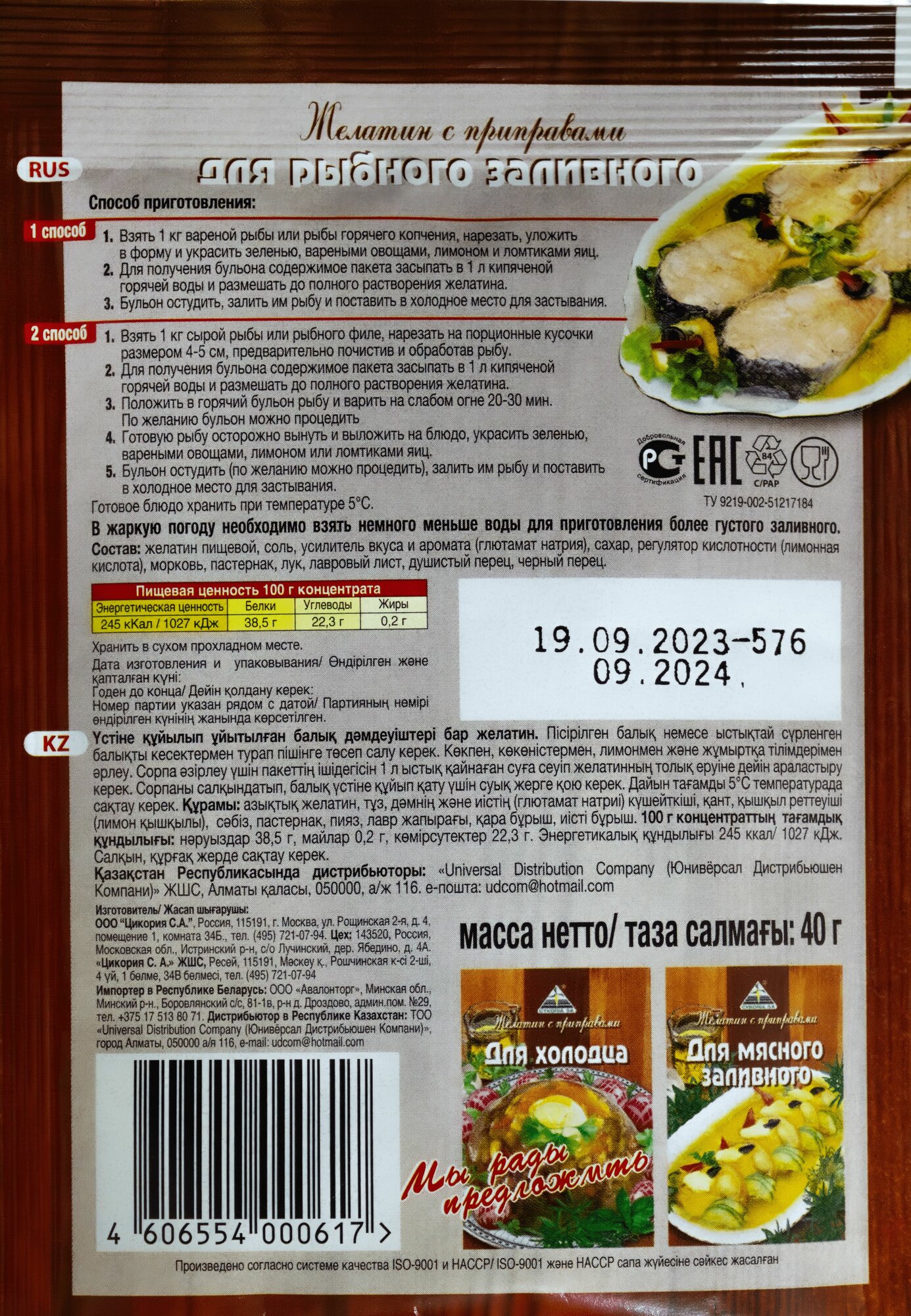 | Состав | желатин пищевой, соль, усилитель вкуса, сахар, регулятор кислотности (лимонная кислота), морковь, пастернак, лук, лавровый лист, душистый перец, черный перец |