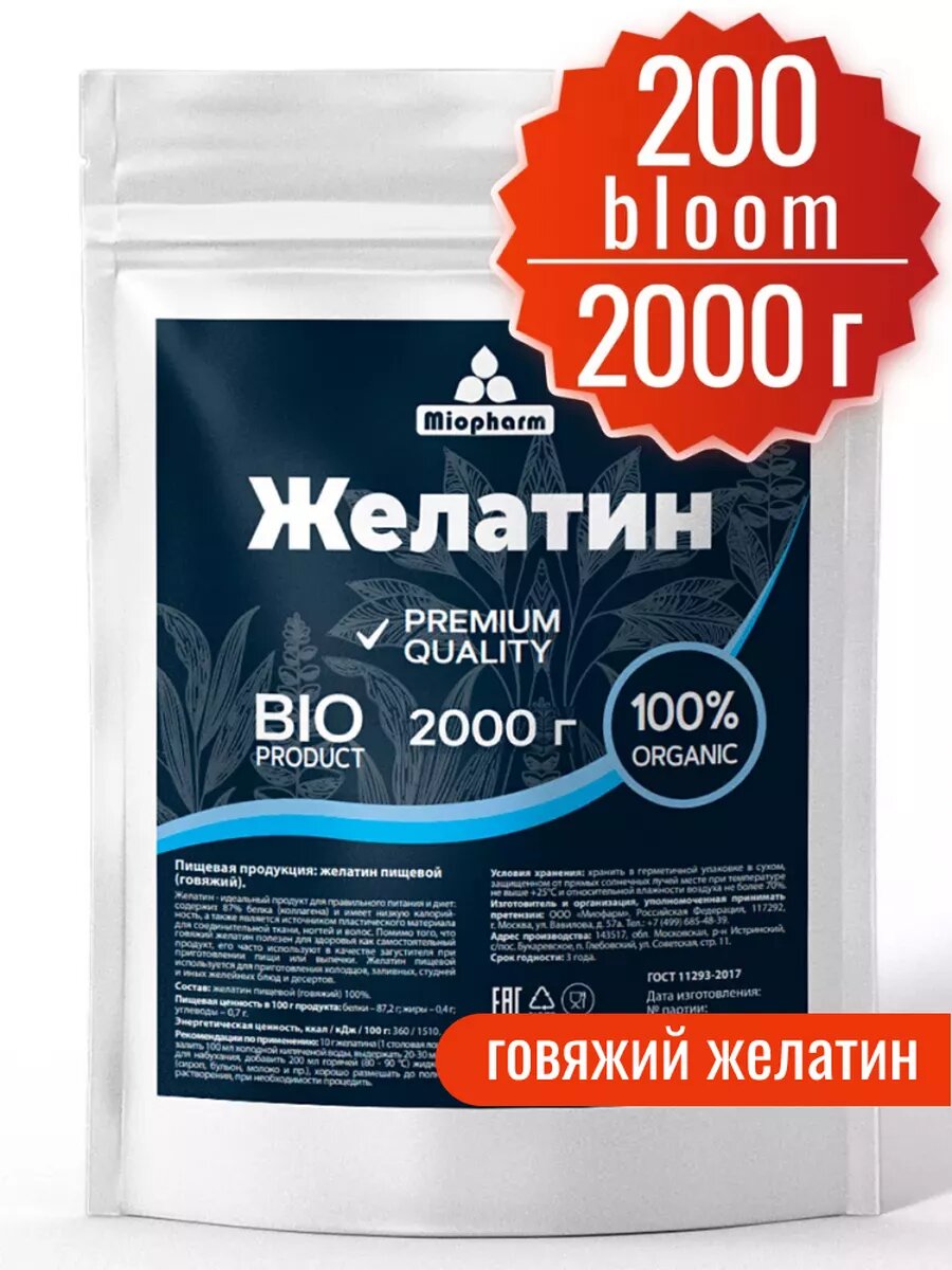 Купить Желатин пищевой говяжий, 87% белка (коллаген) BIO. Аналог агар агар, все для выпечки, для приготовления десертов, холодца, желе, заливного. 2000г