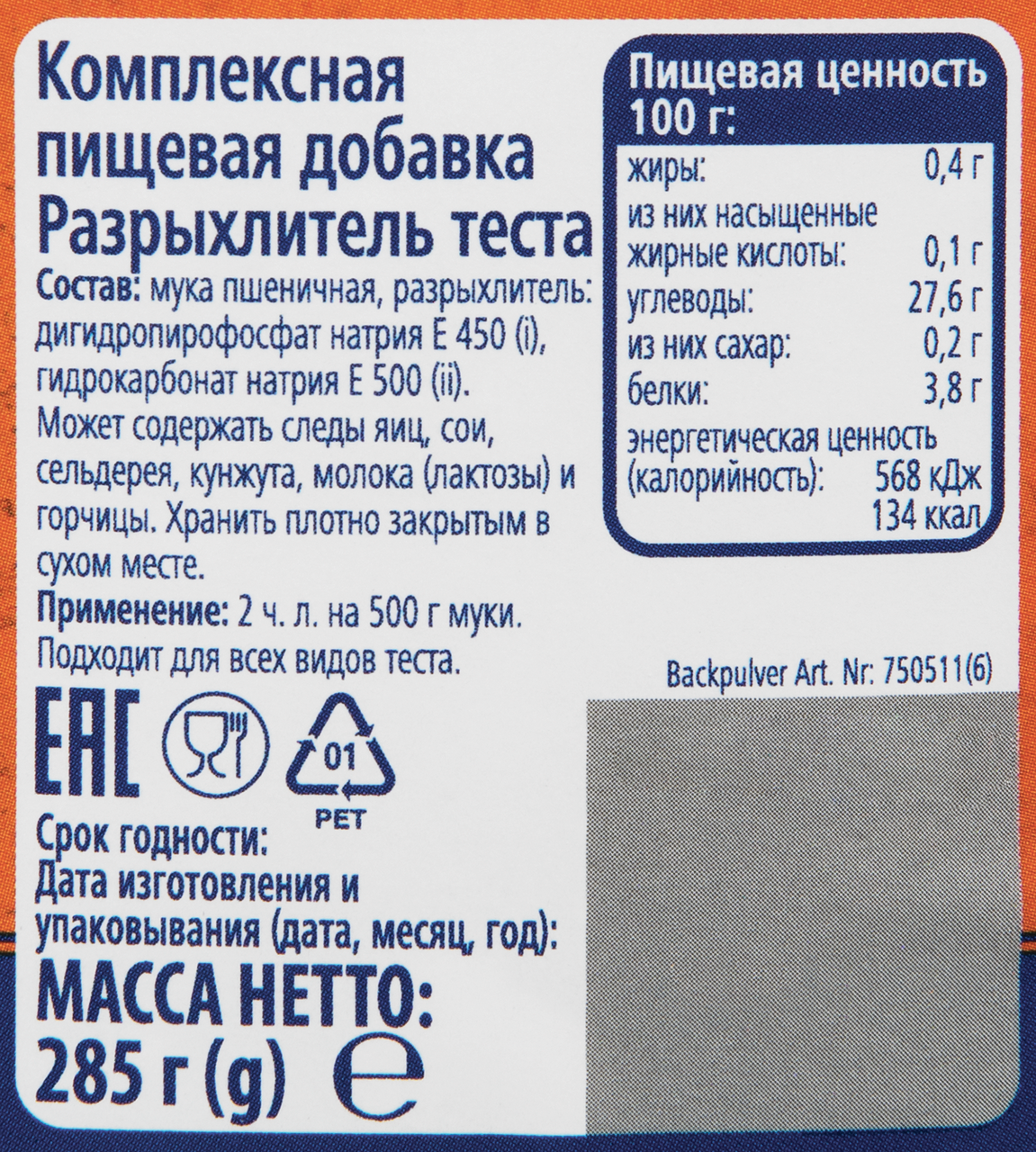 | Состав | Мука пшеничная, разрыхлитель: дигидропирофосфат натрия Е450 (i), гидрокарбонат натрия Е450 (i,i). |