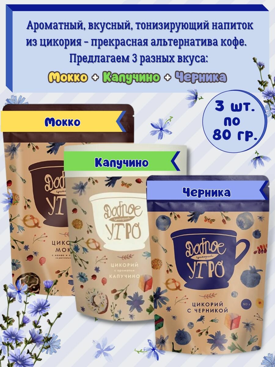 Купить Доброе утро Цикорий натуральный - вкус Мокко, Капучино, Черника, 3 упаковки по 80гр