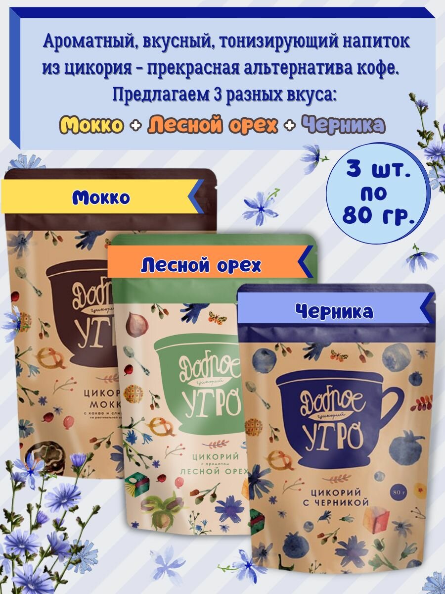 Купить Доброе утро Цикорий натуральный - вкус Мокко, Лесной орех, Черника, 3 упаковки по 80гр