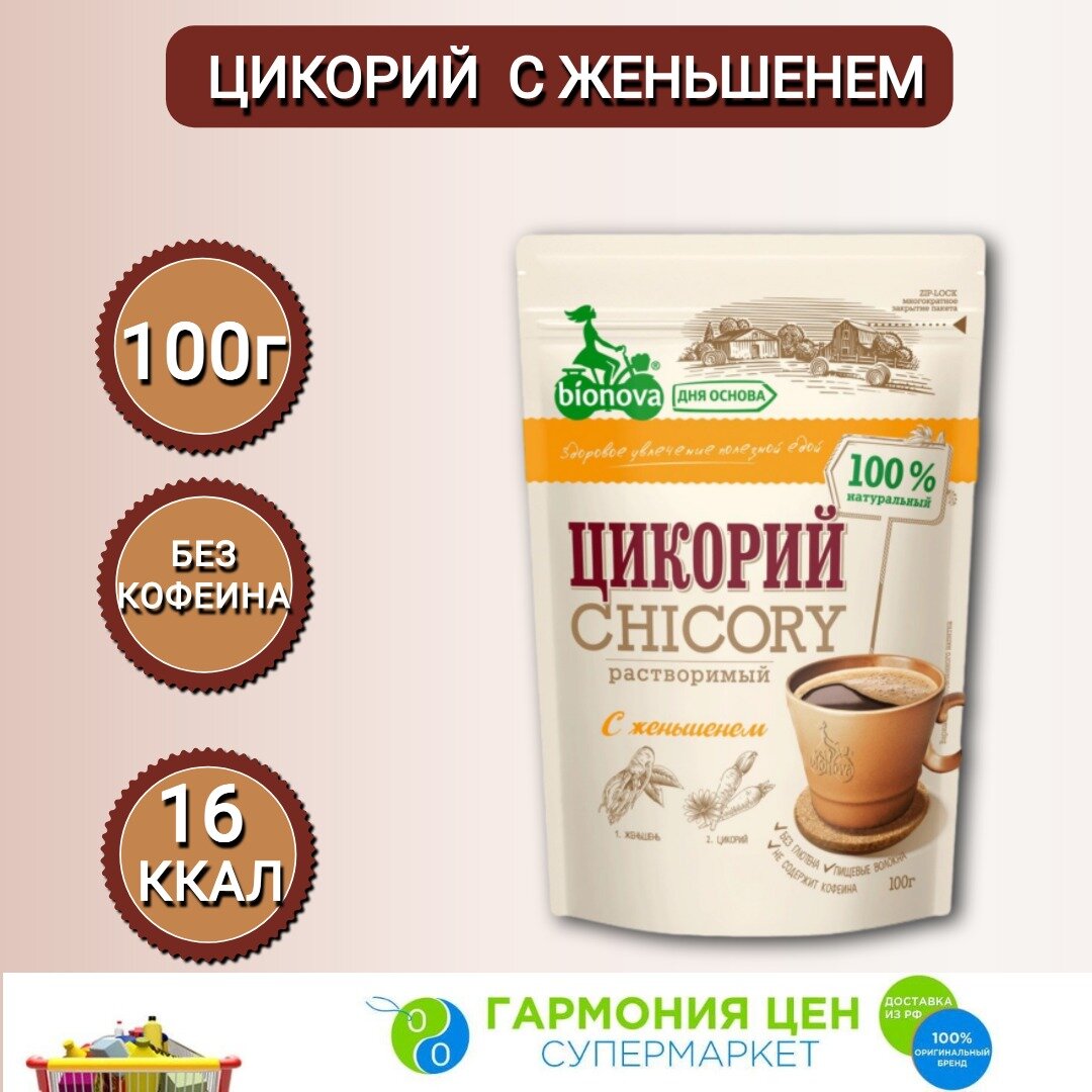 Купить Цикорий BIONOVA натуральный С женьшенем растворимый без кофеина, пакет, 100 г