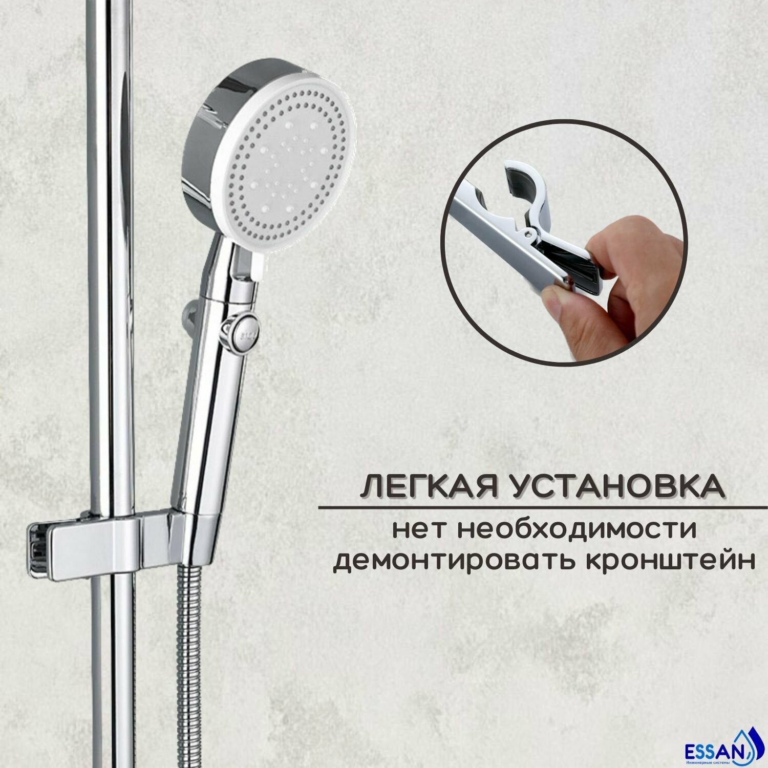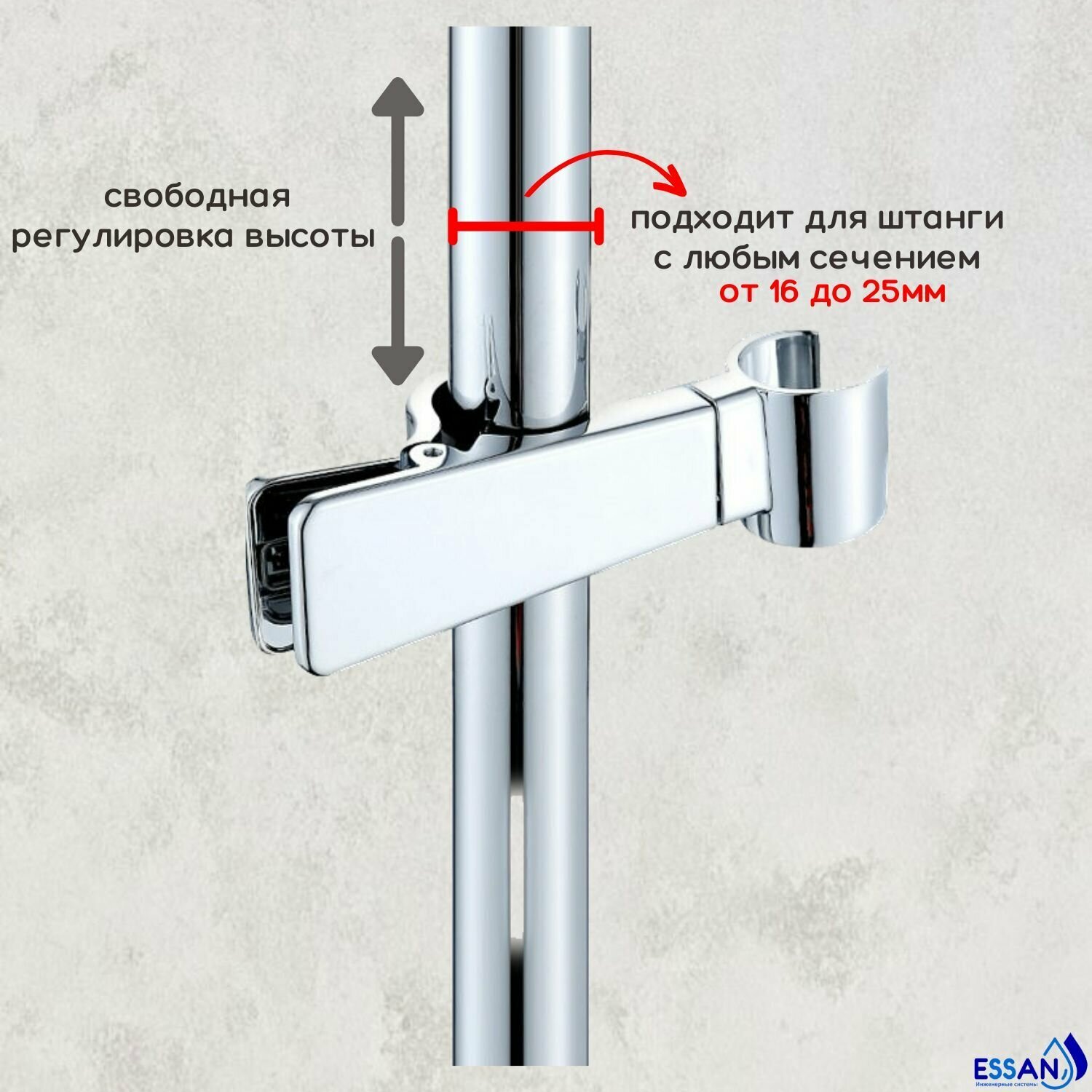 Держатель лейки для душевой стойки, универсальный "скользящий" ESSAN PIN зажим 16-25 мм, хром, держатель лейки душа интересное: