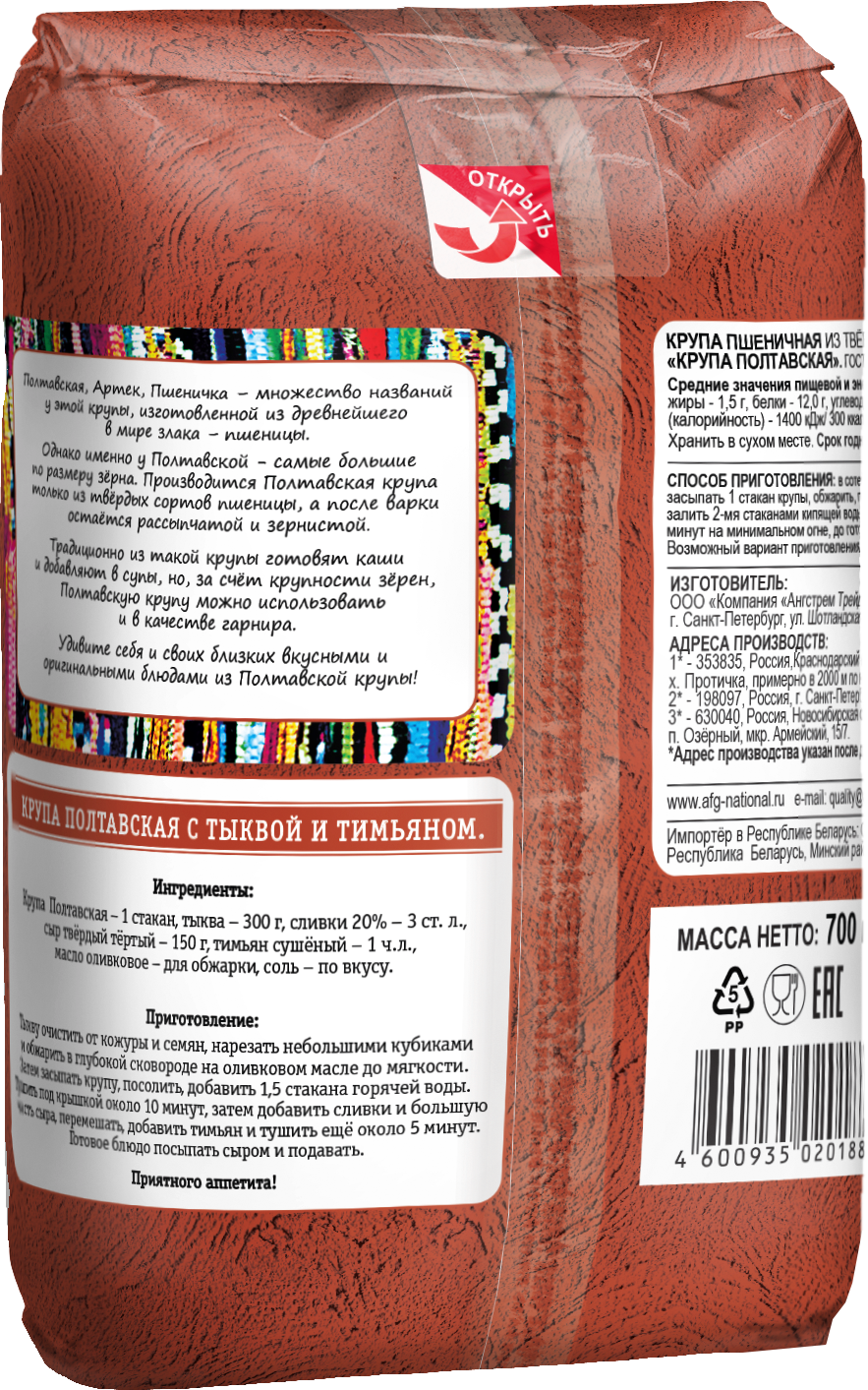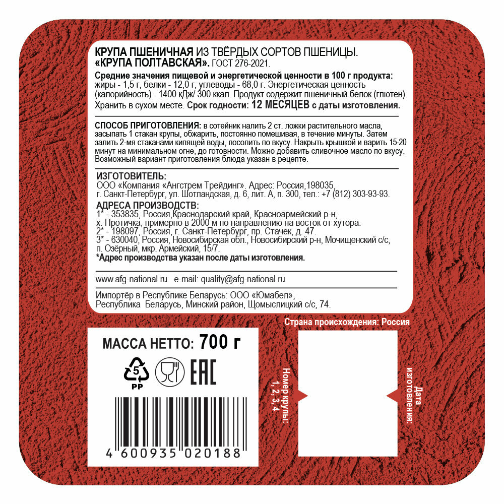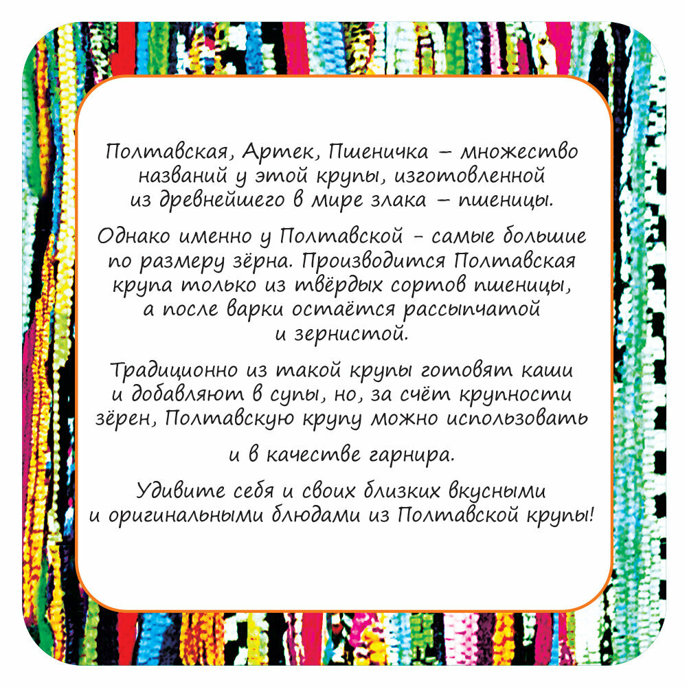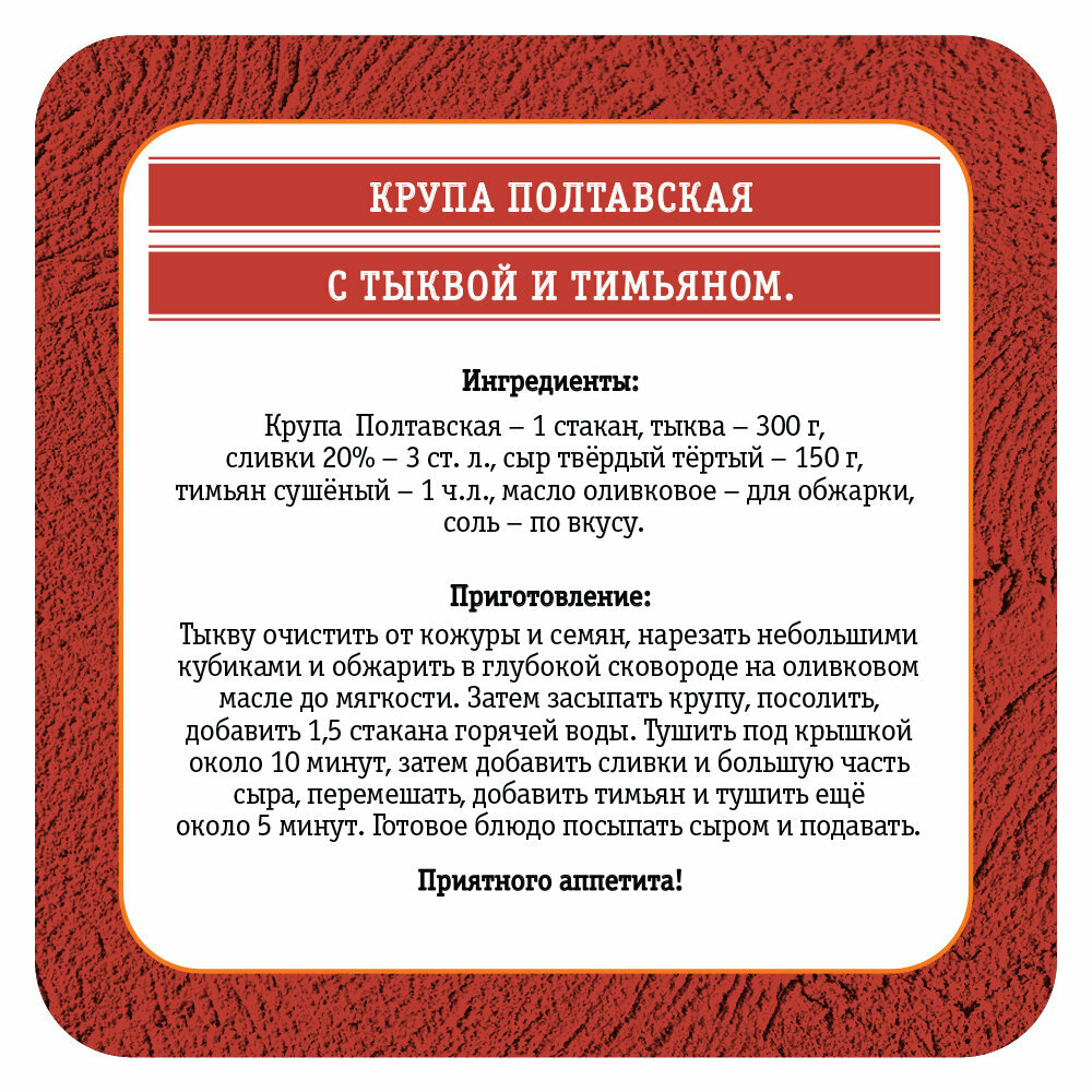 | Состав | Крупа пшеничная из твердых сортов пшеницы "Крупа Полтавская" |