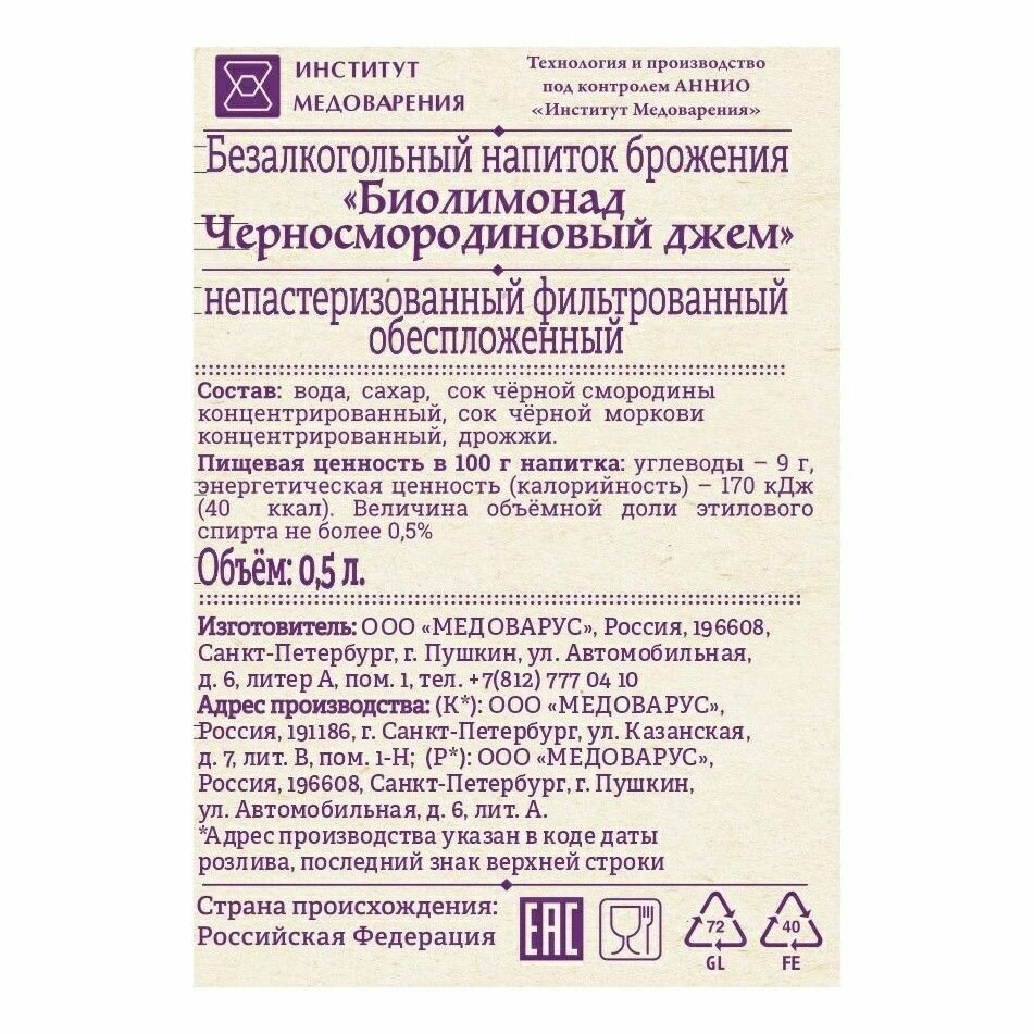 Лимонад "Черносмородиновый джем" RIDE от Медоварус, 10бут по 0,5л интересное: