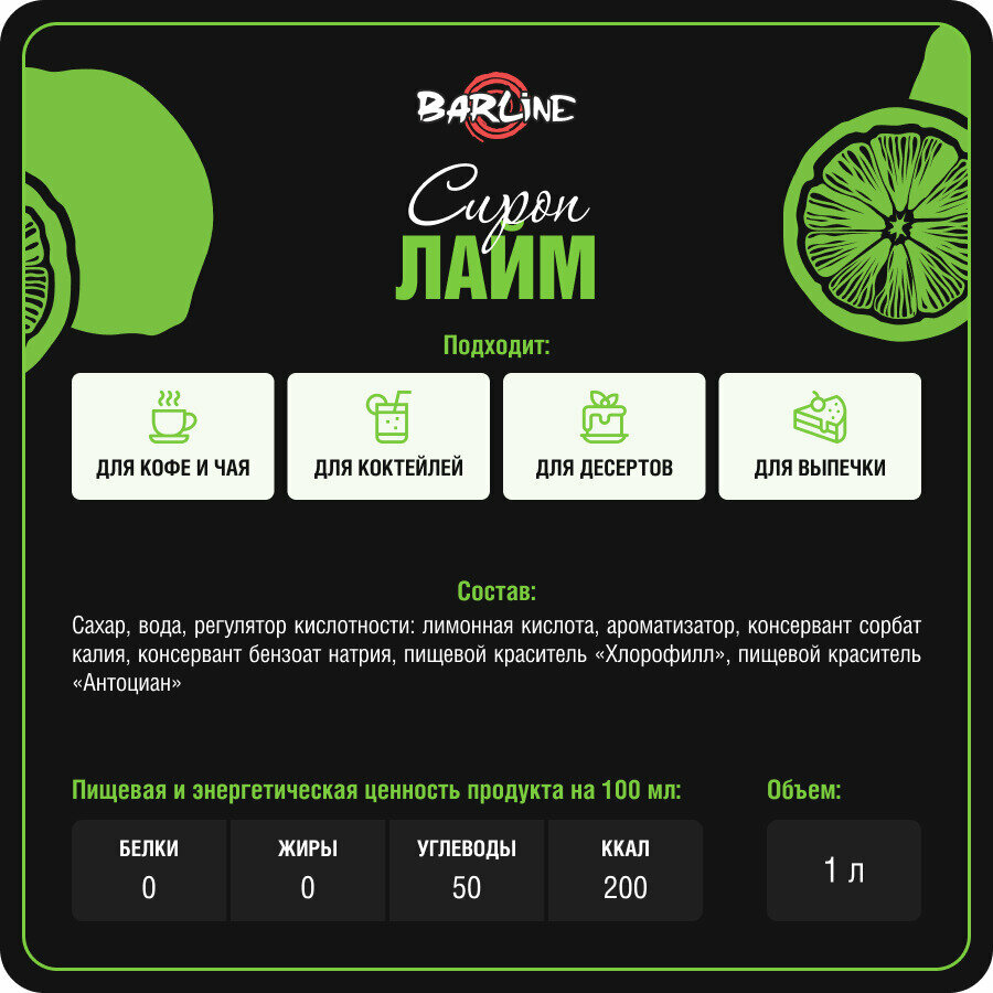 СохранитьСироп Barline Лайм (Lime), 1 л, для кофе, чая, коктейлей и десертов, стеклянная бутылка c рассекателем, Барлайн интересное: