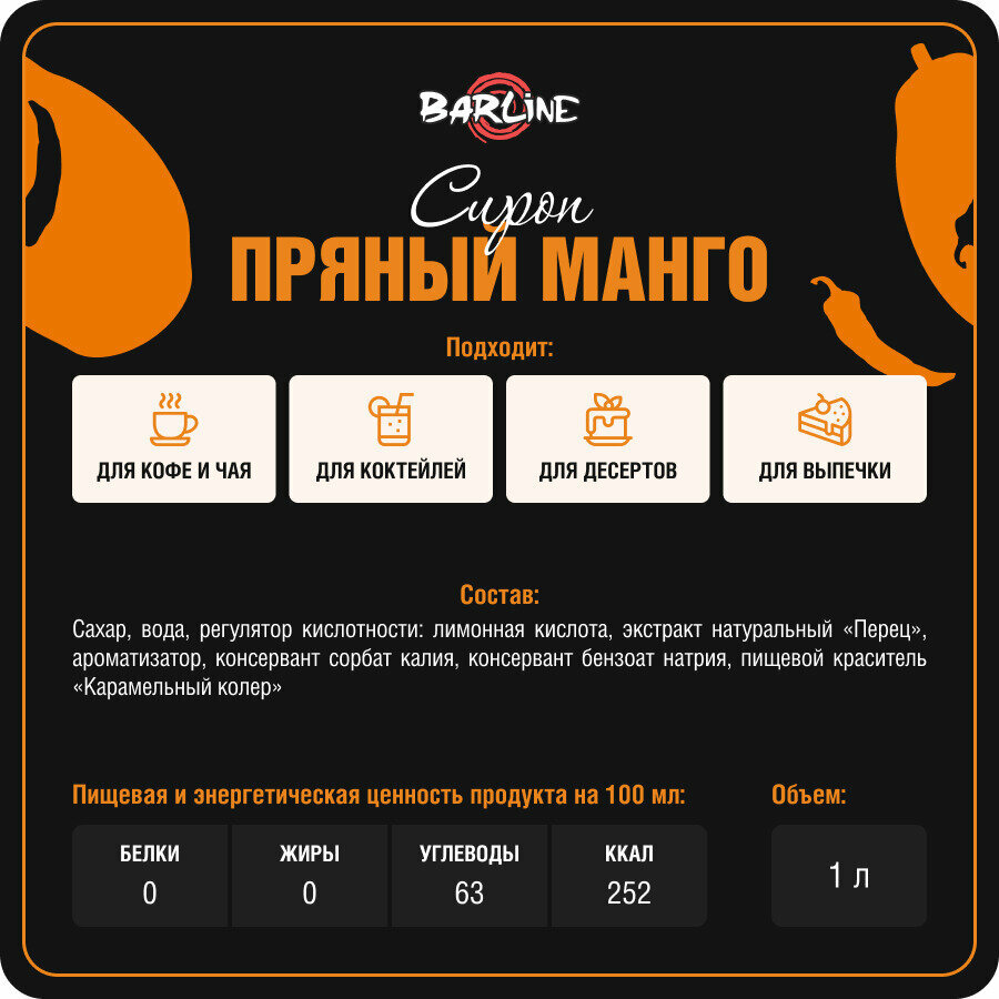 СохранитьСироп Barline Пряный манго (Spicy mango), 1 л, для кофе, чая, коктейлей и десертов, стеклянная бутылка с дозатором, Барлайн интересное: