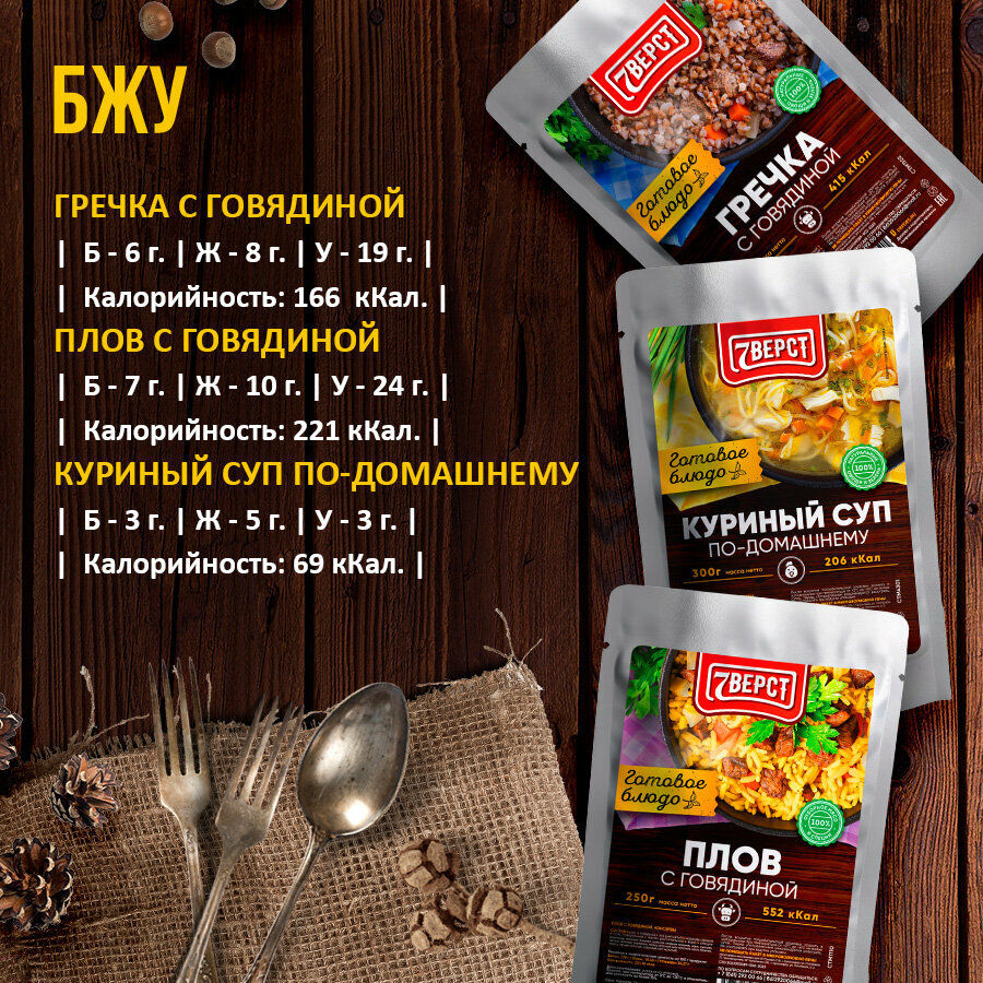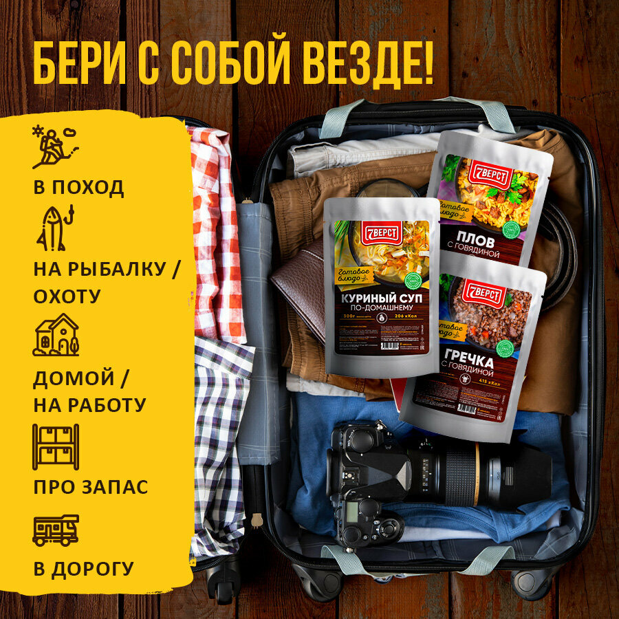 Сохранить7 вёрст Готовые блюда в фольге Набор 3 уп. (плов с говядиной, куриный суп, гречка с говядиной) Консервы для походов, охоты, рыбалки интересное: