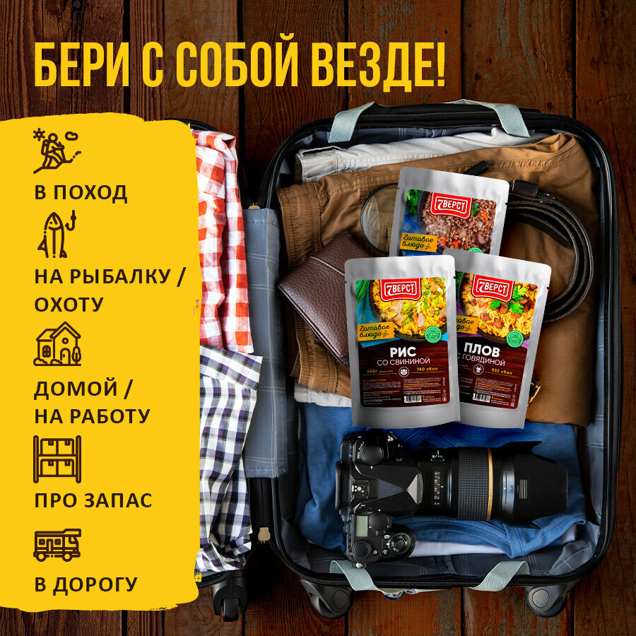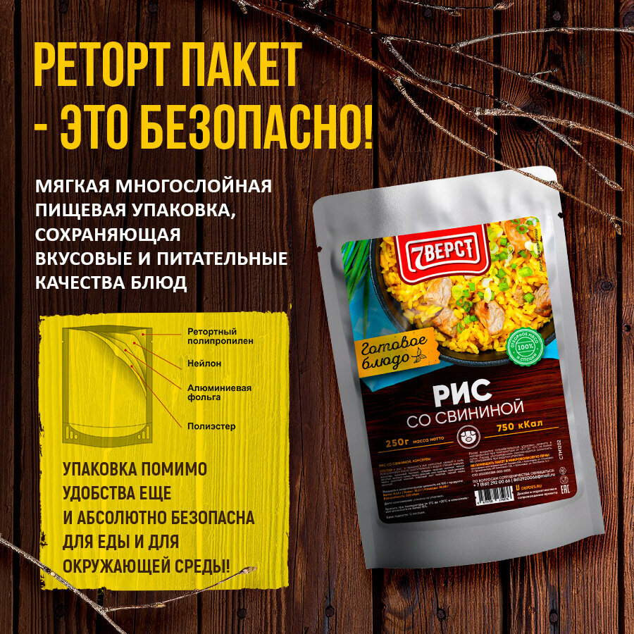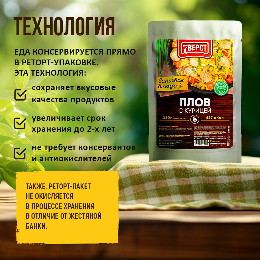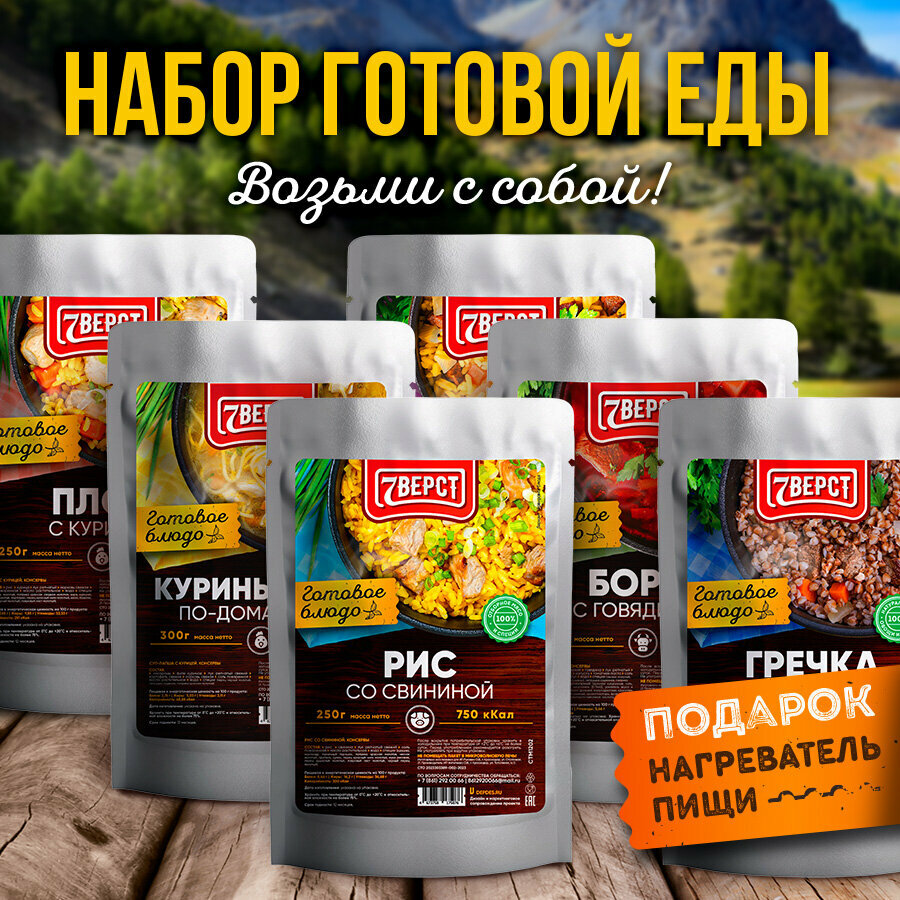 Сохранить7 вёрст Готовые блюда в фольге Набор 6 уп. + Подарок БНП 2 шт. (плов с курицей, куриный суп, рис со свининой, гречка, борщ, плов с говядиной) Консервы для походов, охоты, рыбалки интересное: