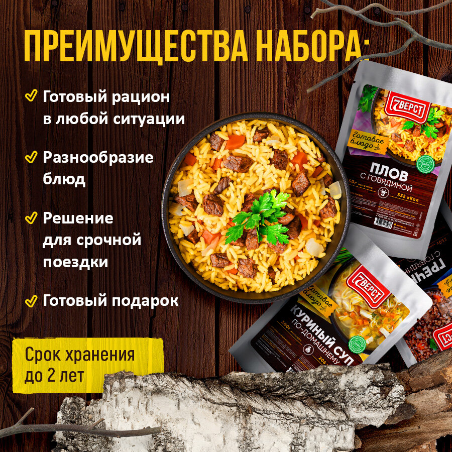 7 вёрст Готовые блюда в фольге Набор 3 уп. (плов с говядиной, куриный суп, гречка с говядиной) Консервы для походов, охоты, рыбалки