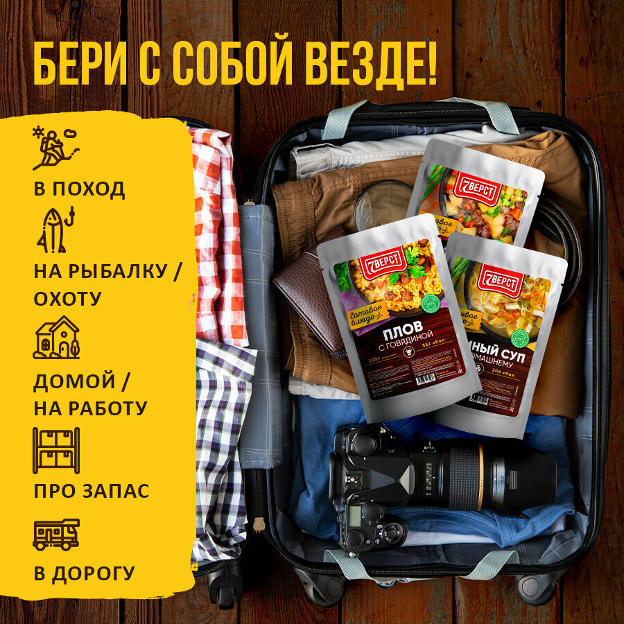 Сохранить7 вёрст Готовые блюда в фольге Набор 4 уп. + Подарок БНП 1 шт. (картофель с говядиной, куриный суп, плов с говядиной) Консервы для походов, охоты, рыбалки интересное: