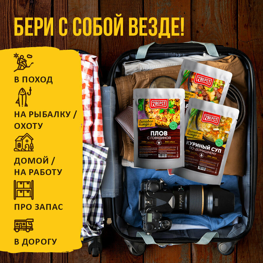 7 вёрст Готовые блюда в фольге Набор 4 уп. + Подарок БНП 1 шт. (картофель с говядиной, куриный суп, плов с говядиной) Консервы для походов, охоты, рыбалки