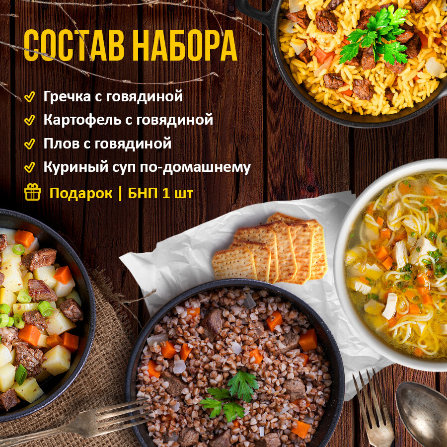 Сохранить7 вёрст Готовые блюда в фольге Набор 4 уп. + Подарок БНП 1 шт. (гречка, картофель, плов с говядиной, куриный суп) Консервы для походов, охоты, рыбалки интересное: